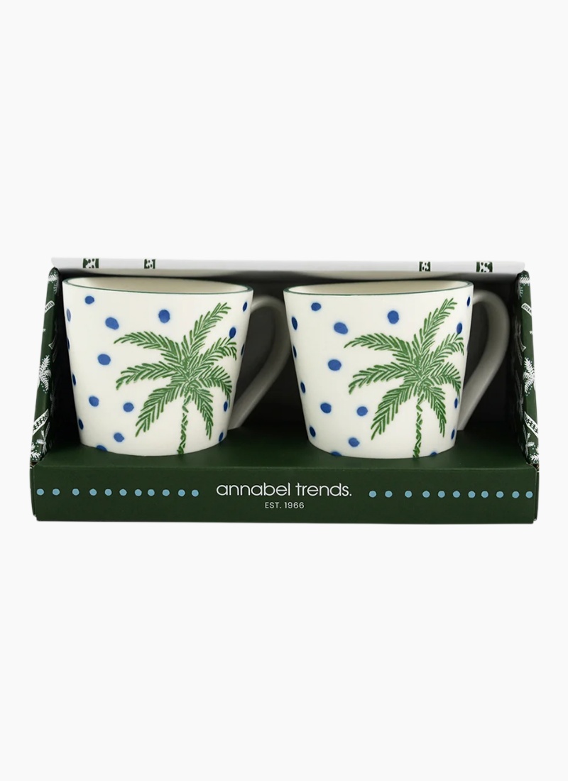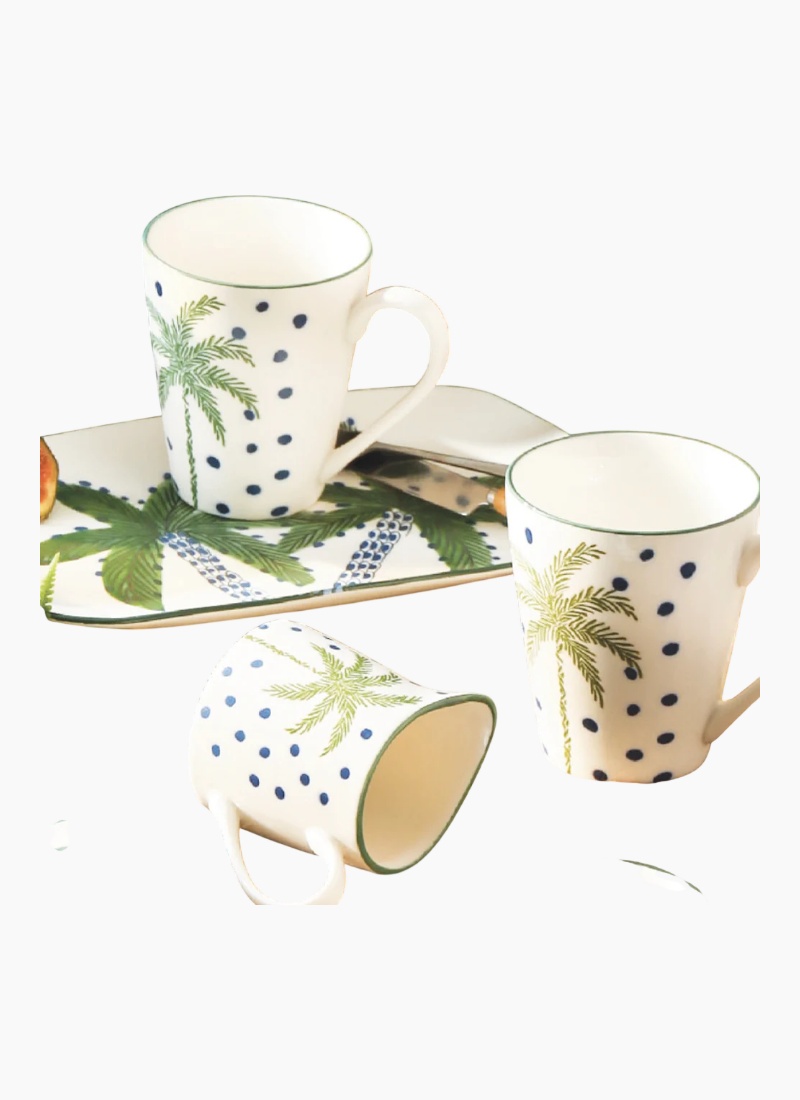 - Perfect for the Kitchen, these white ceramic mugs feature a green palm motif and playful blue spots for an instant coastal accent