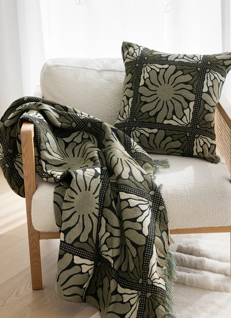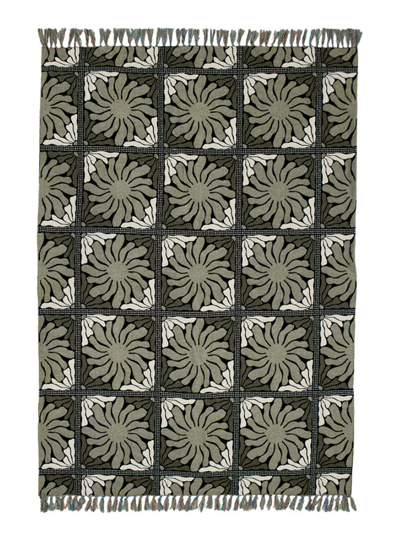 The Zinnia design features a large floral design. This multipurpose throw blanket can be used inside as a throw on the bed or couch, or as a picnic rug laid out on the grass or sand. It is made from a strong woven tapestry fabric that is comfortable to sit on, and easy to machine wash. A large portion of the fabric is made using recycled cotton, which is great for an eco-conscious shopper