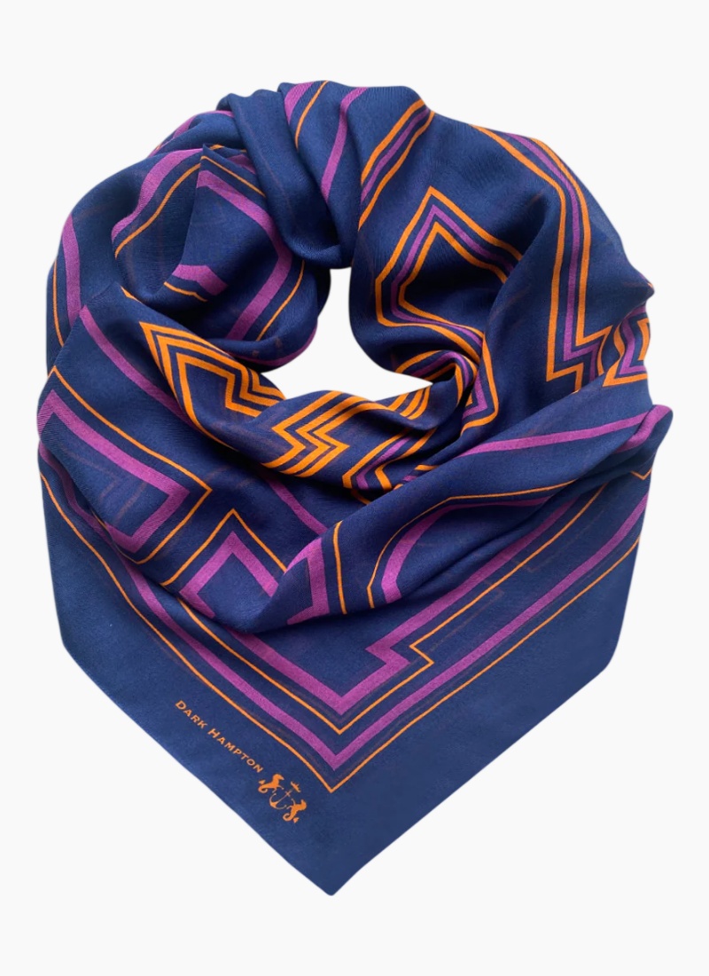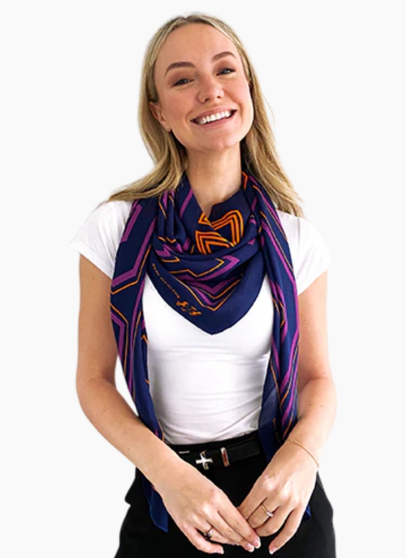 90% Modal, 10% Cashmere. Lightweight and soft feel. Dimensions are 120x120cm A classic navy scarf with a pop of vibrant orange and deep purple. Our scarves are delicate and should be handled with care. They are handmade and each one is slightly unique. Delivered in an elegant reusable gift bag.