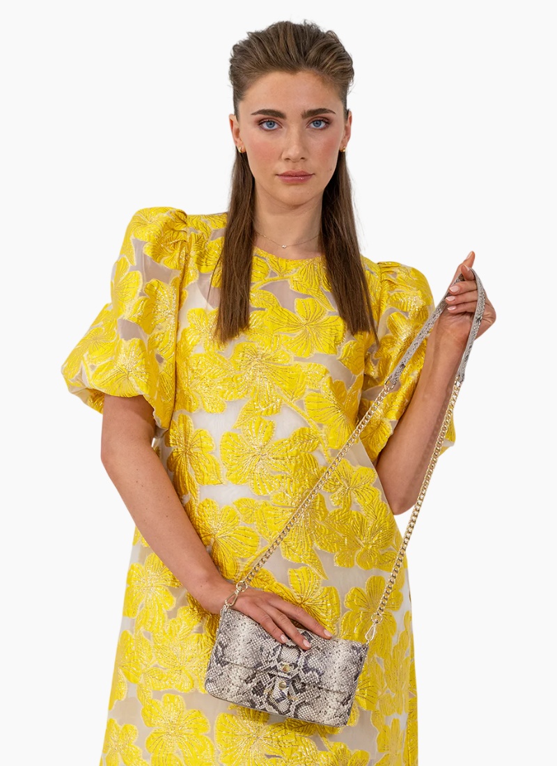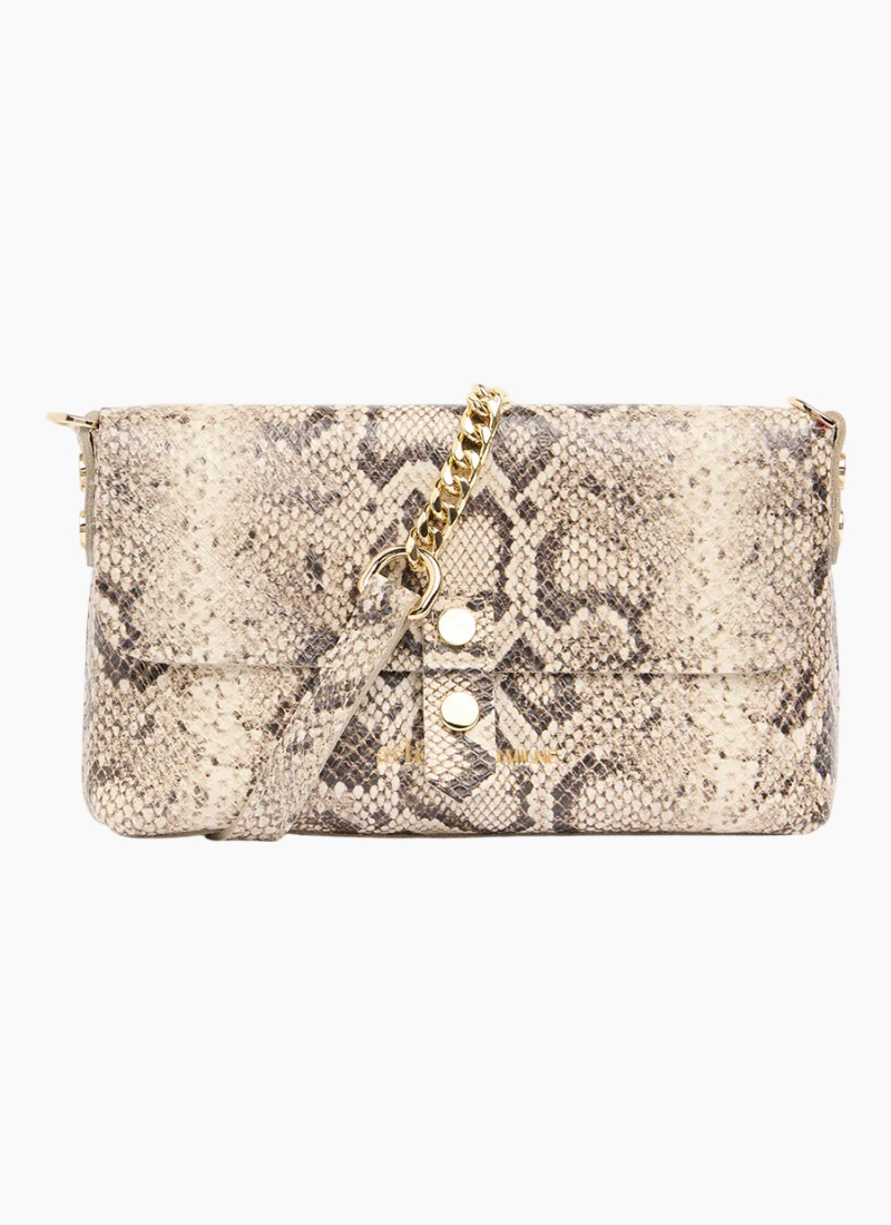 The Arlington Milne Paige Wallet is crafted from premium leather. With soft body, crossbody styling, the wallet has two strap options, a long leather strap that is adjustable/removable and the other with light gold chain detailing. The envelope closure opens to reveal Arlington Milnes signature hot pink lining, interior card slots, coin pouch and key clip. Height: 12cm Width: 20cm Depth: 3cm