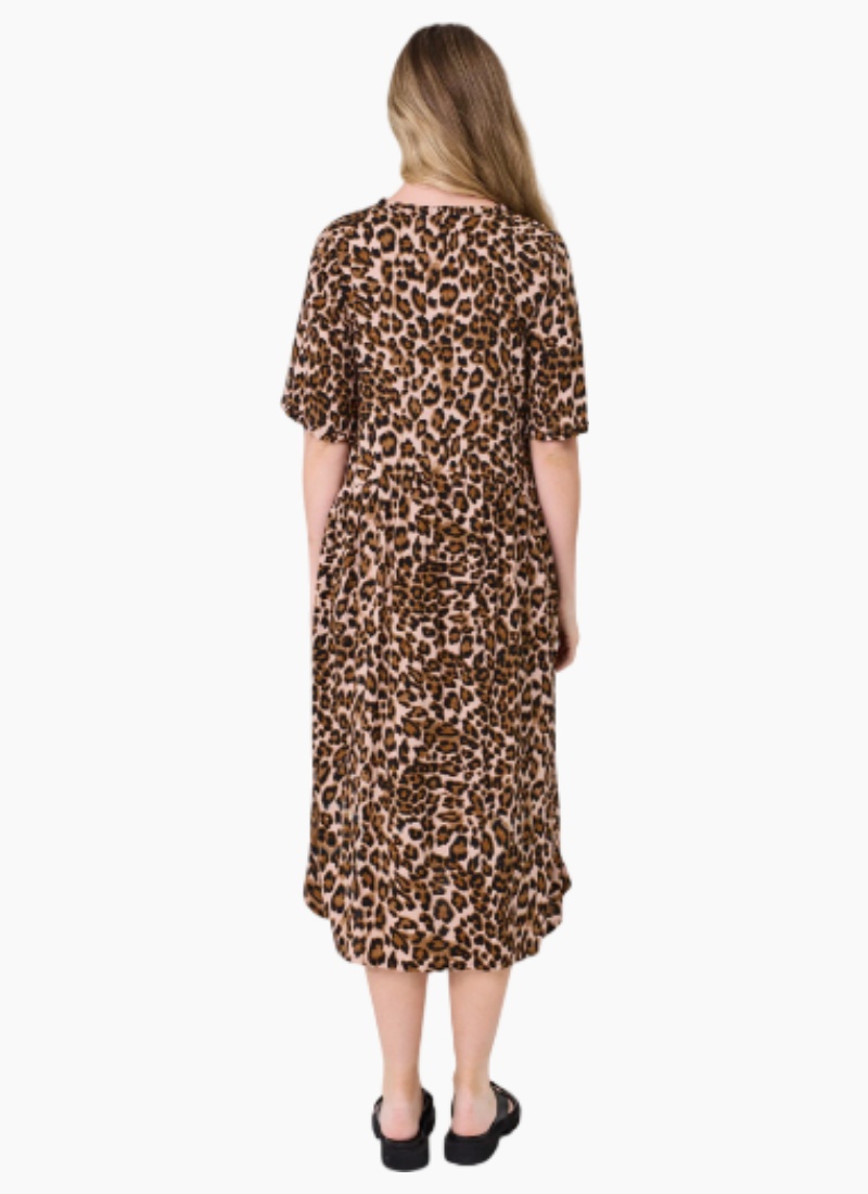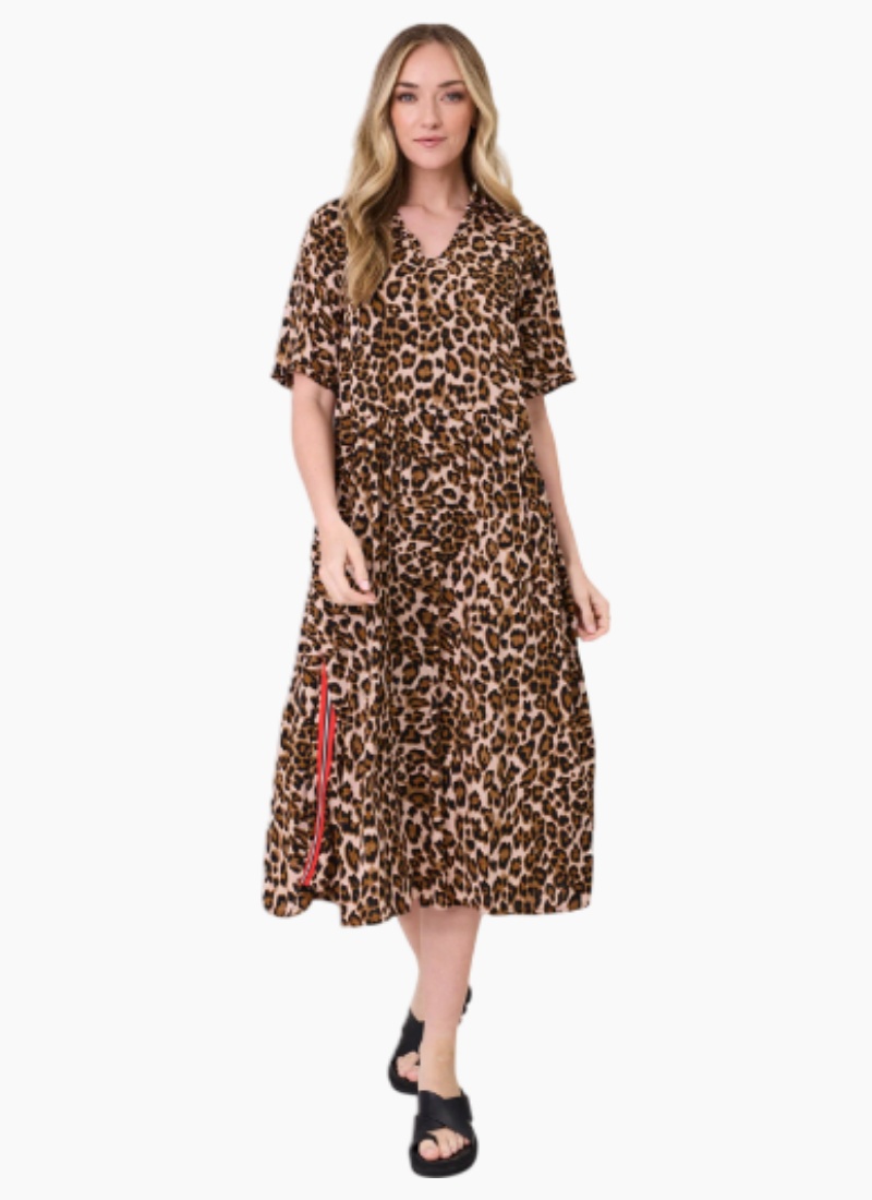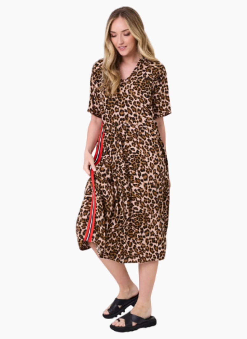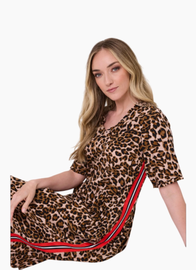 Introducing the LEONA DRESS from Lemon Tree. A relaxed, midi-length Casual/Day Dresses piece that brings bold leopard colour and effortless style to your wardrobe.Leopard print with a bold red, white, and black stripe down the side panels. Features a V-neckline, short sleeves, and handy side pockets. Falls just below the knee for a flattering, everyday fit.
