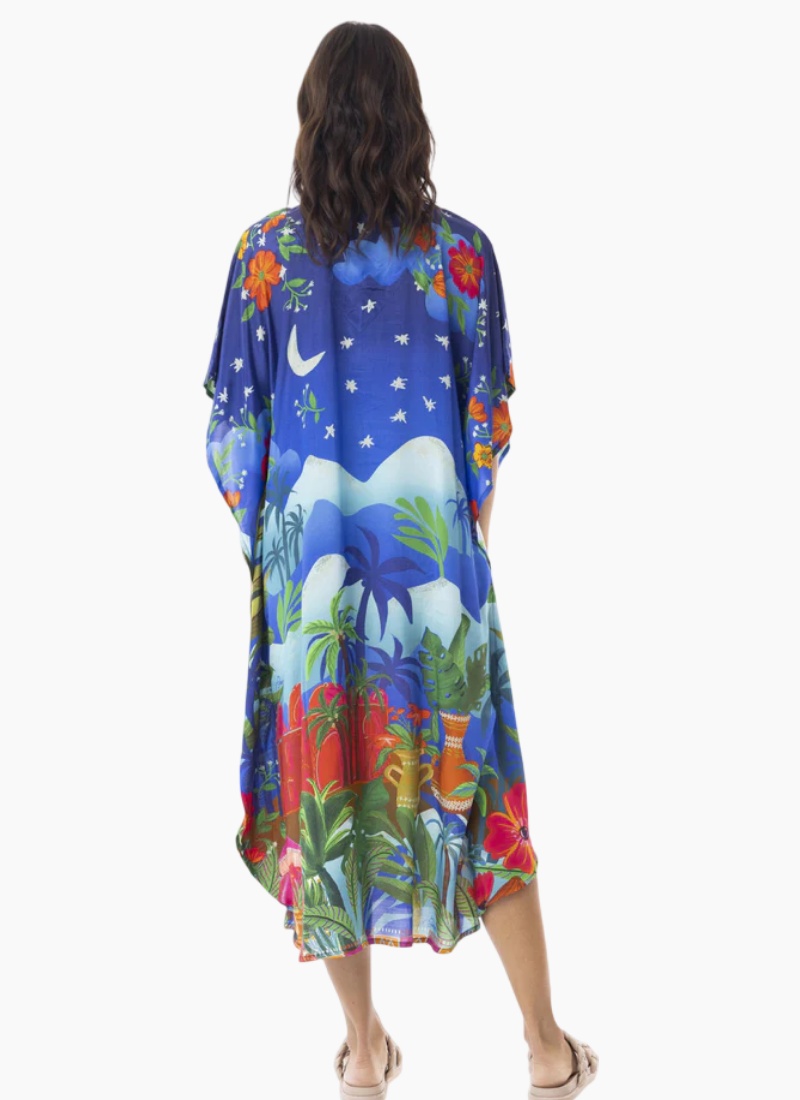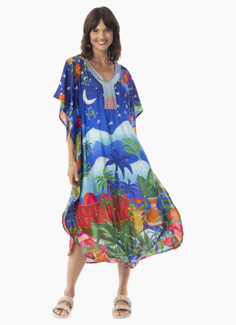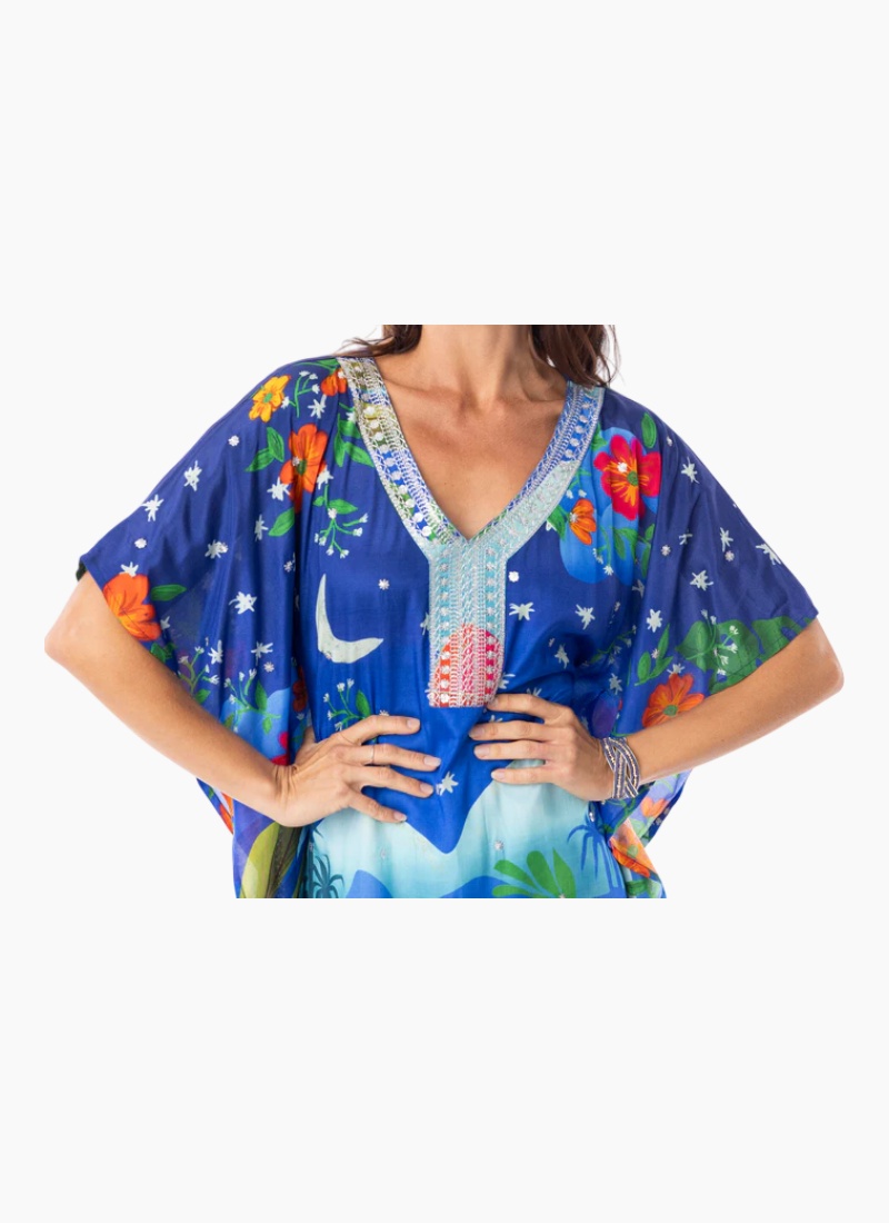 This vibrant, flowing kaftan-style maxi captures effortless summer glamour with a striking blue base and exotic motifs.