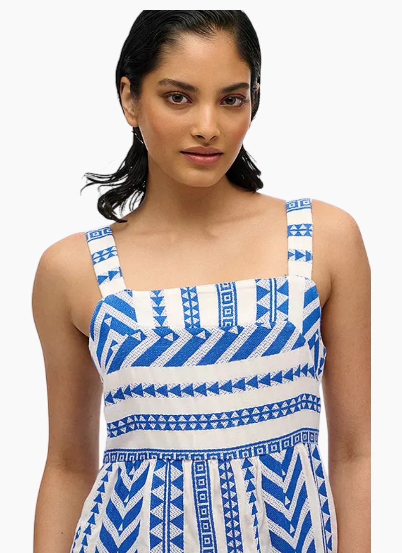 Introducing the Statement Tiered Maxi Dress from Superdry. A breezy, printed maxi that channels holiday-ready ease with bold blue and white geometric motifs.