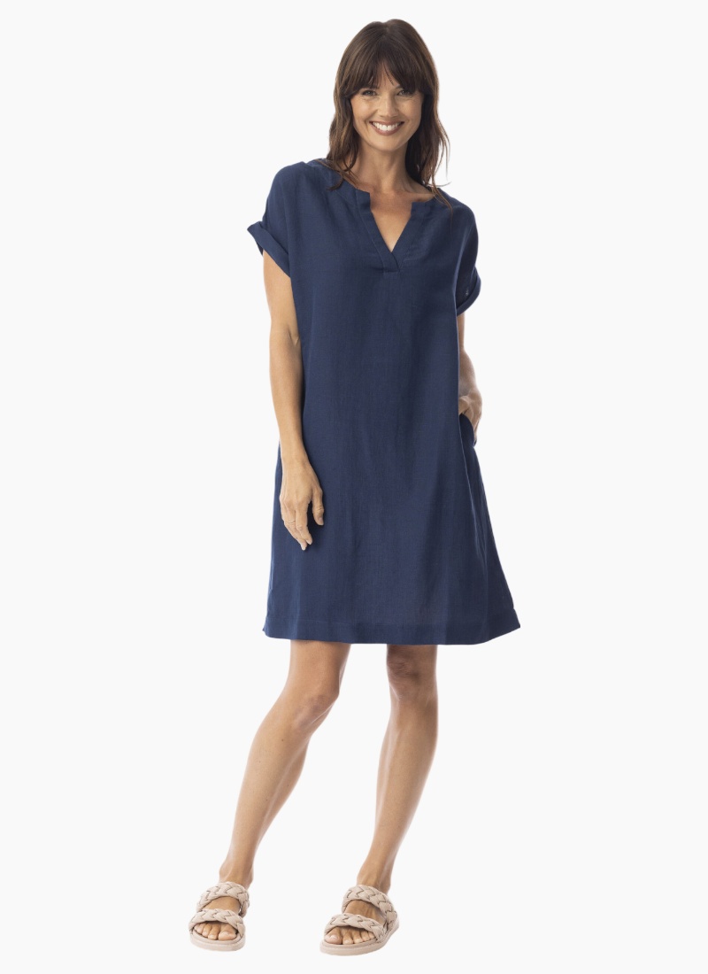 Introducing the Escape Linen Solid Dress Shift cap slv. This effortless navy shift dress is crafted from breathable linen for relaxed, all-day comfort.