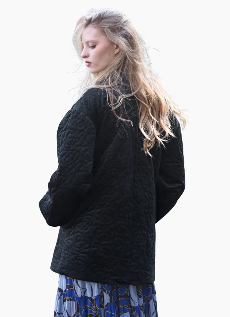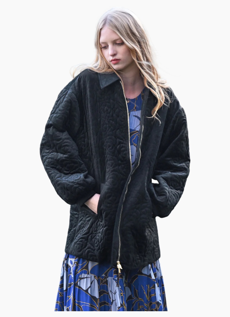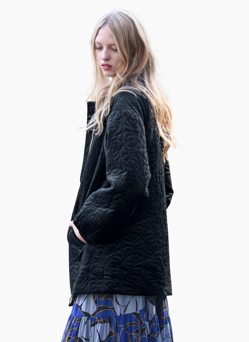 A rich floral quilted velvet elevates the 'Proven Quilty' jacket, crafted in 'Quilty by Suspicion'. Its dual-ended zip front allows versatile styling, while blouson sleeves with fixed cuffs add subtle volume and shape. Thoughtfully designed with side pockets and a fully lined interior, this jacket blends tactile luxury with modern, fashion-led functionality. • Floral quilted fabrication • Dual ended zip front • Side pockets • Blouson sleeve with fixed cuff • Lined