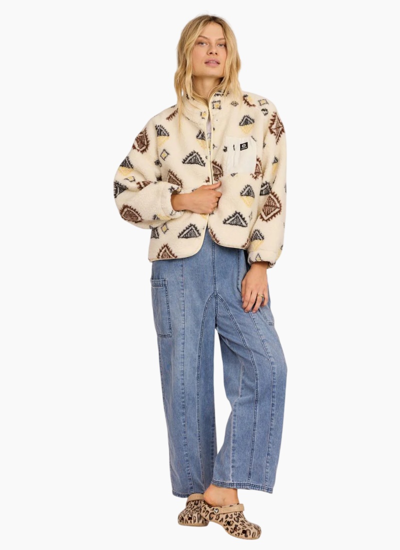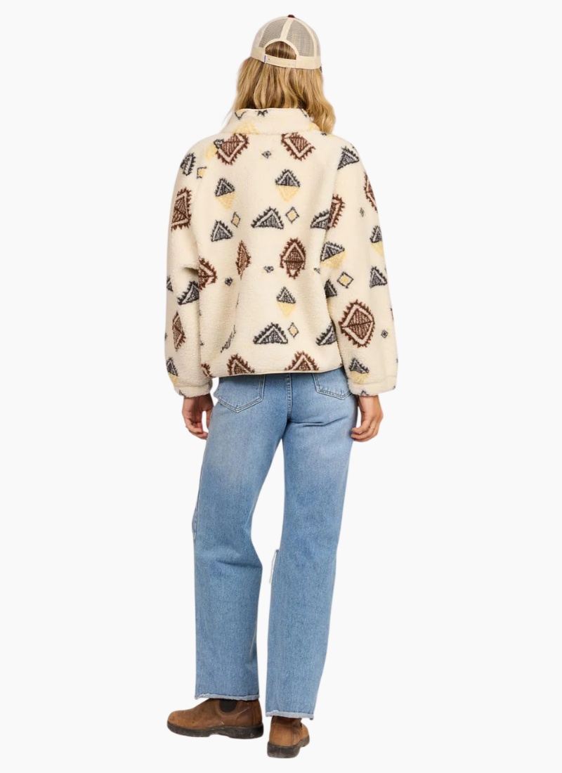 This cozy fleece features raglan sleeves and a snap-button front. It includes a nylon zip pocket on the left chest and handy side seam pockets for your essentials.