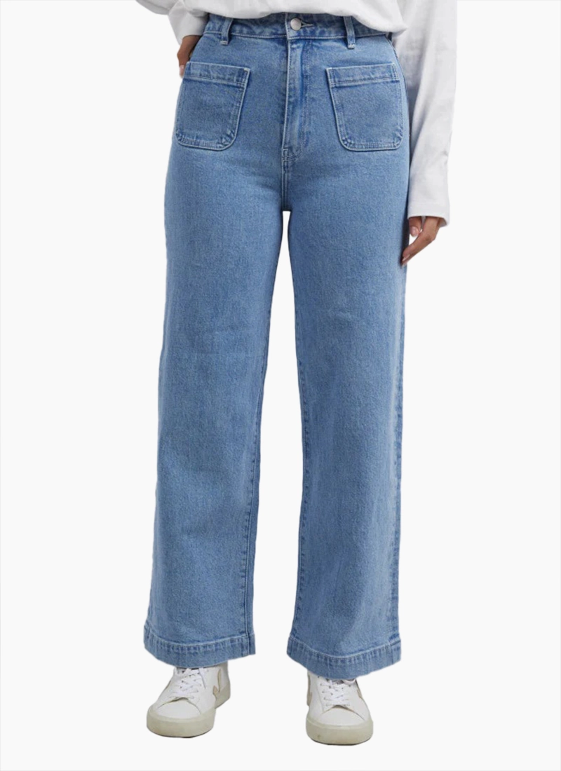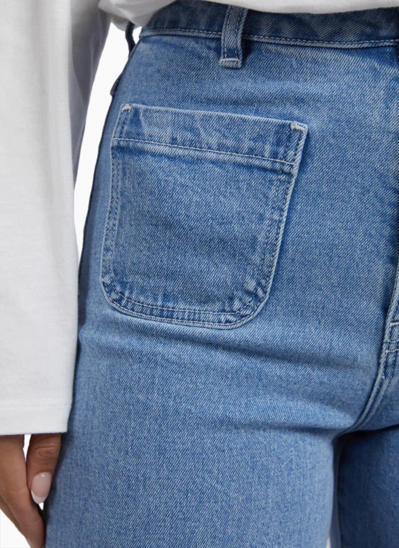 A high-rise jean featuring front patch pockets, a fitted waist and slightly wide leg.