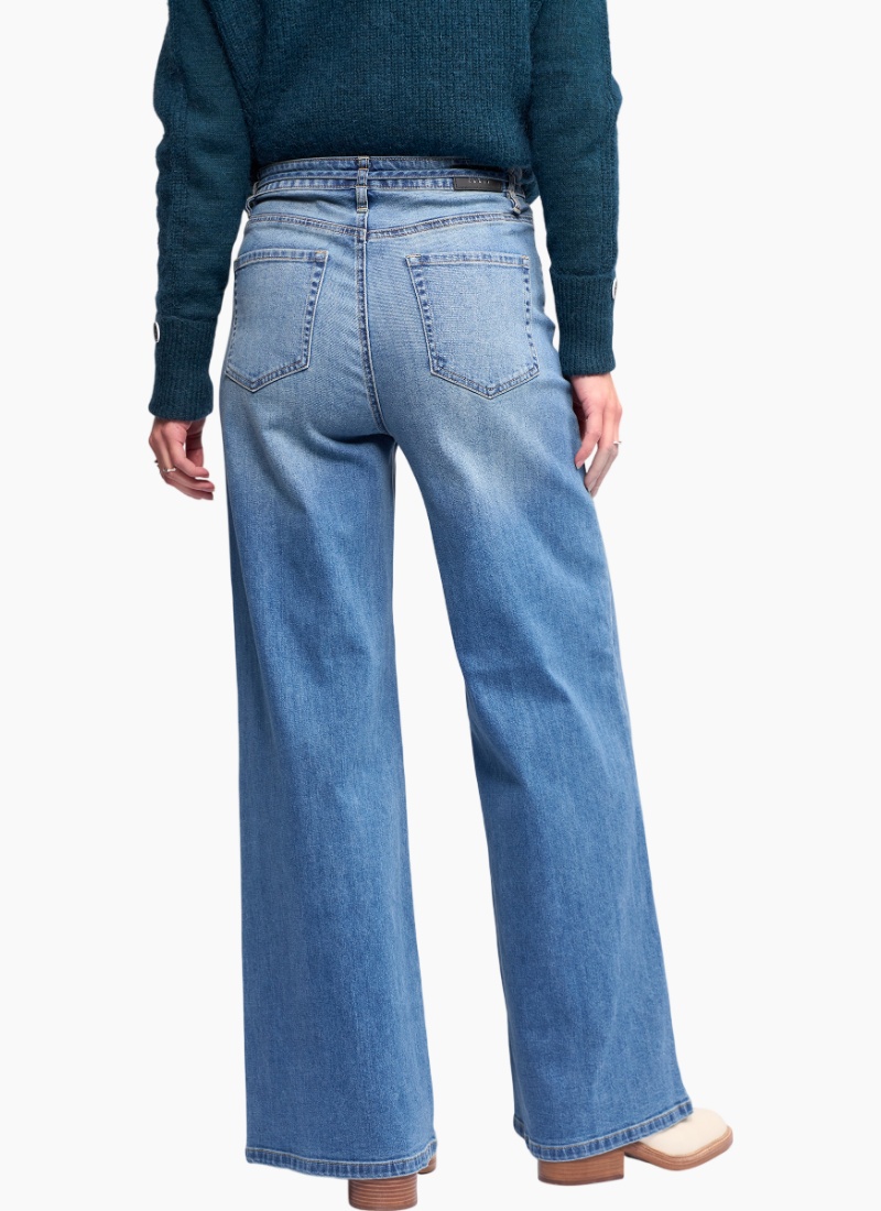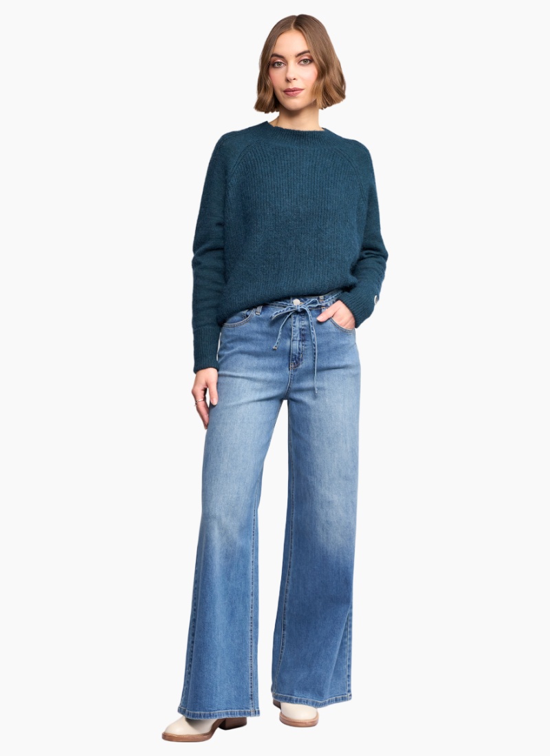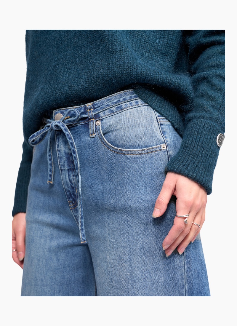 Full-length wide-leg jean in Washed Denim — a mid-blue wash with a softly worn finish. Finished with a removable skinny denim tie belt that can be tied at the front.• Wide leg, full length jean • Waistband features metal KNEWE logo button closure, 2 front beltloops and 3 back beltloops • Zip fly • Removable skinny denim tie belt • Front side angle pockets with coin pocket • Back patch pockets • Leather 'KNEWE' brand patch on wearers back right-hand side waistband • Model wears size 10