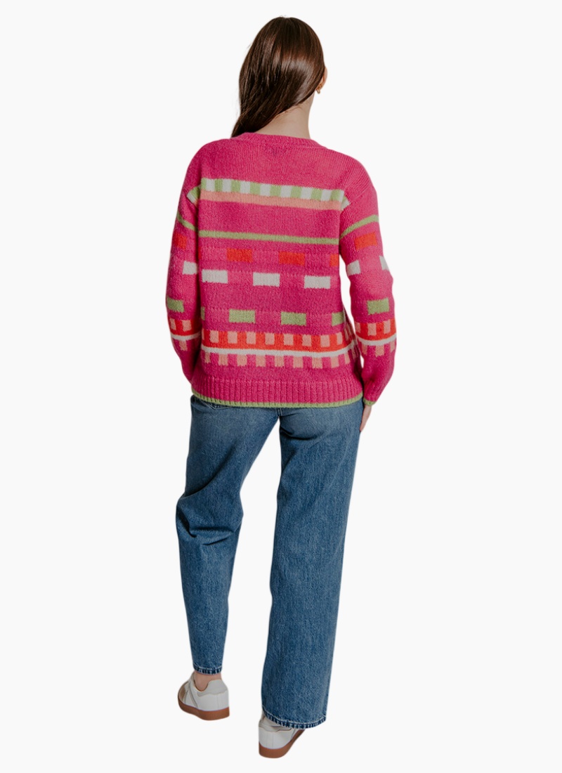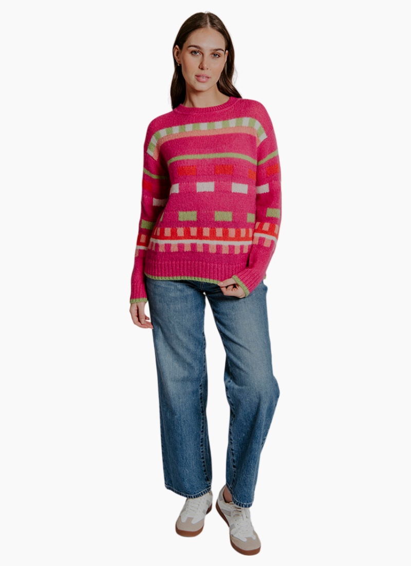 Inject playful colour and pattern into your wardrobe with the Geo Jacquard Pullover. Featuring a bold geometric jacquard design, this sweater blends vivid hues and unique rectangular motifs for a fresh, eye-catching look. It’s a perfect statement piece for casual days and the layering season. • Distinct geometric jacquard pattern creating bold, graphic interest. • Classic crew neck design with a relaxed, comfortable fit. • Ribbed neck, cuffs, and hem for a polished finish and shape retention.
