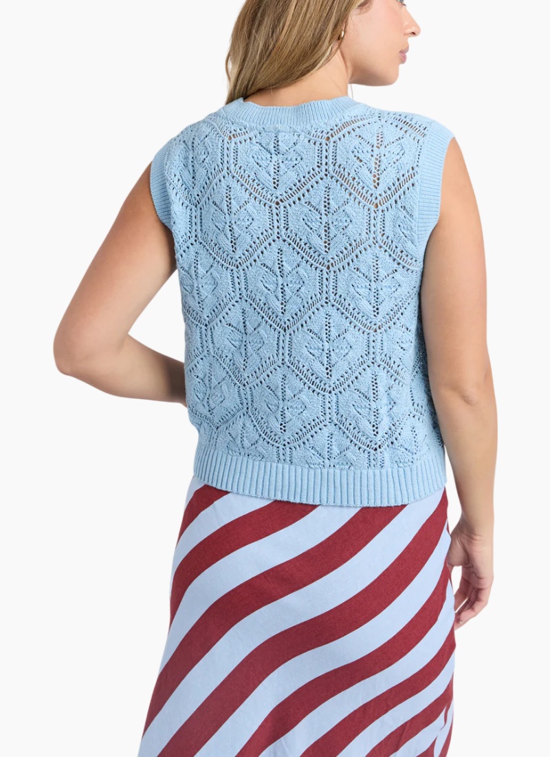 Crochet all the way! The ultimate in seasonal style the Luna Knit Vest is a cute pointelle sleeveless knit in cool vintage white that will look great atop any of your stylish bottoms.Pointelle Knit Design Round Neckline Sleeveless 100% Cotton Our model is 176cm and wears Size 10