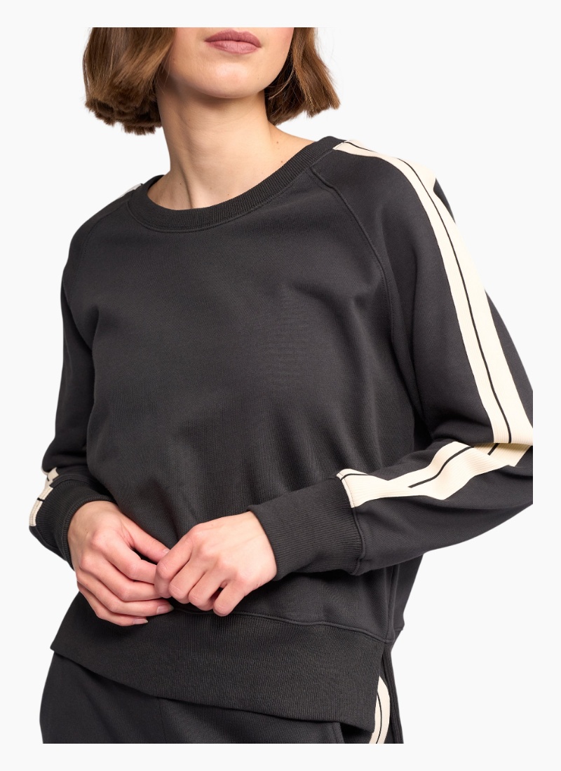 A soft cotton jumper in Slate, a dark grey colour, with contrast tape details in an oat colour. Features • Made from a soft cotton fabric • Long raglan sleeves with cuff and contrast tape detail • Stepped hem with side splits, dipping lower at the back • Wide fit through chest • Tapered waist • Model wears size 10