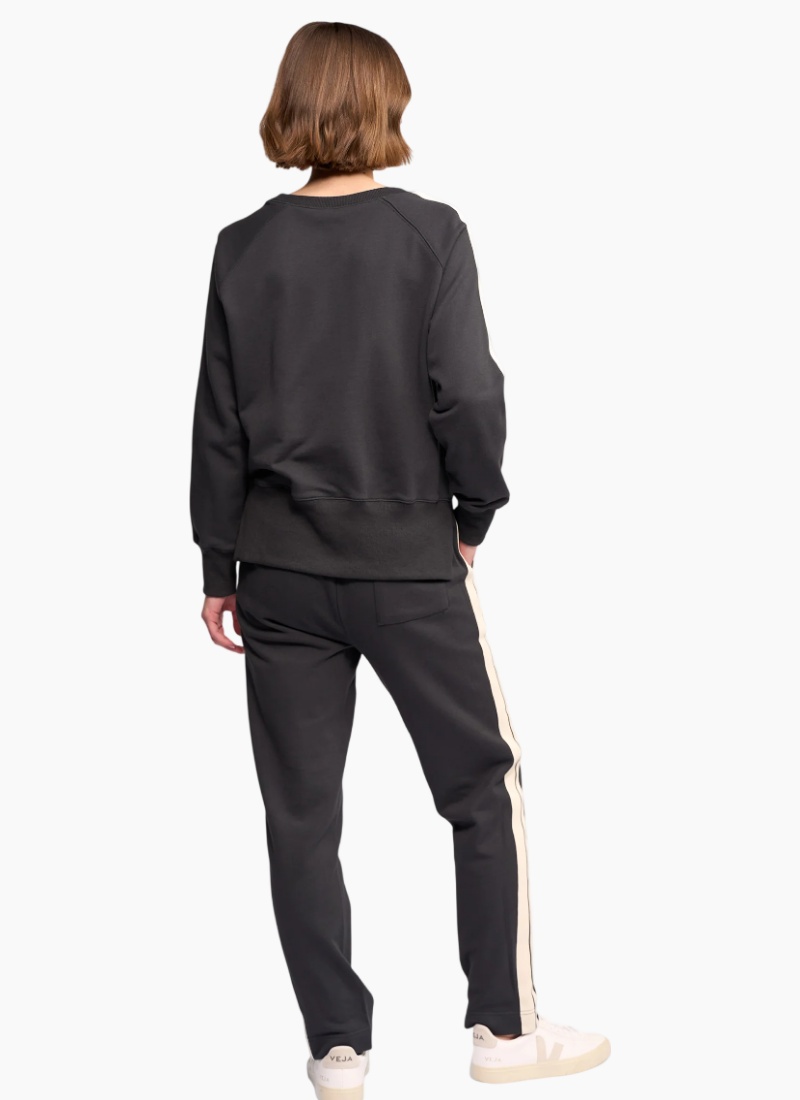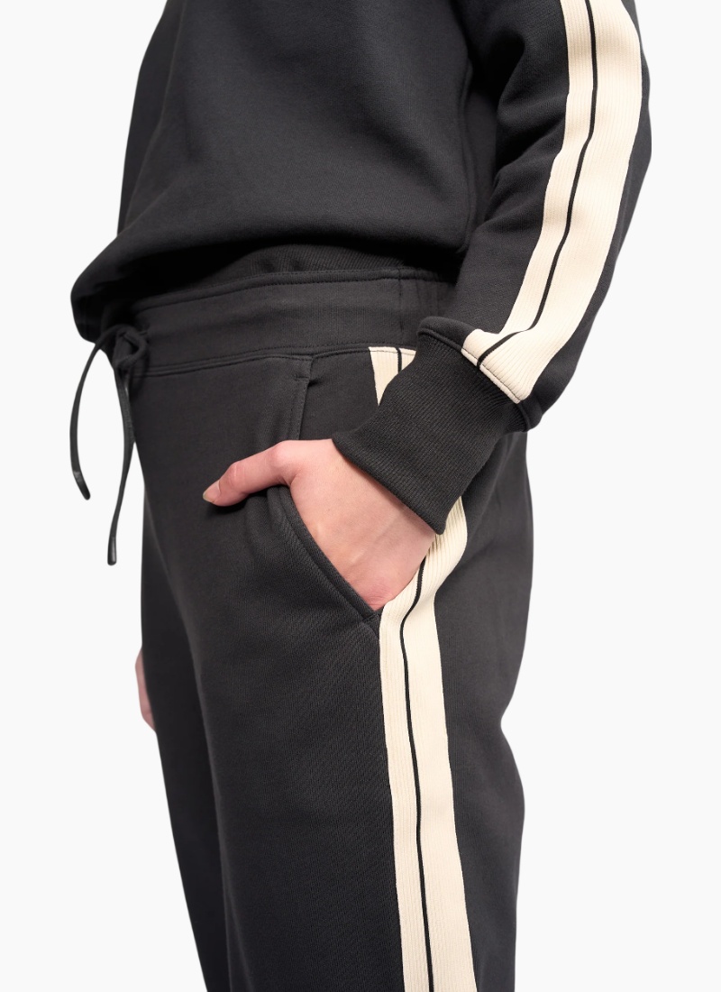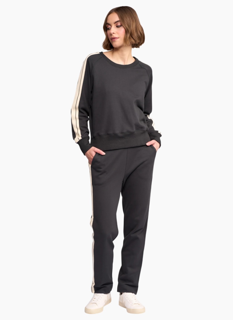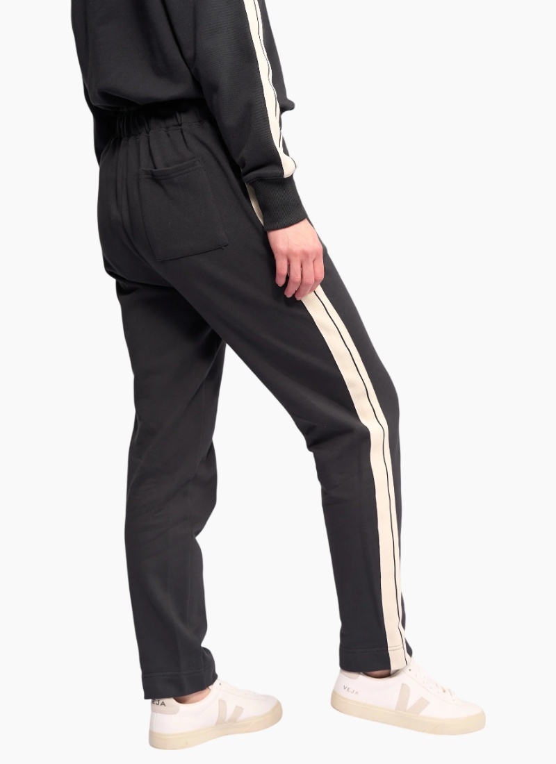 Slim-leg ankle-grazer pant made from a soft cotton fabric in Slate, a dark grey colour. Featuring a contrast tape detail down the legs in an oat colour. Features • Slim leg ankle grazer pant • Made from a soft cotton fabric • Side seam contrast tape detail • Elastic waistband with drawstrings featuring rubber aglets • Front side angle pockets • Back patch pocket • Model is 175cm tall, wears size 10