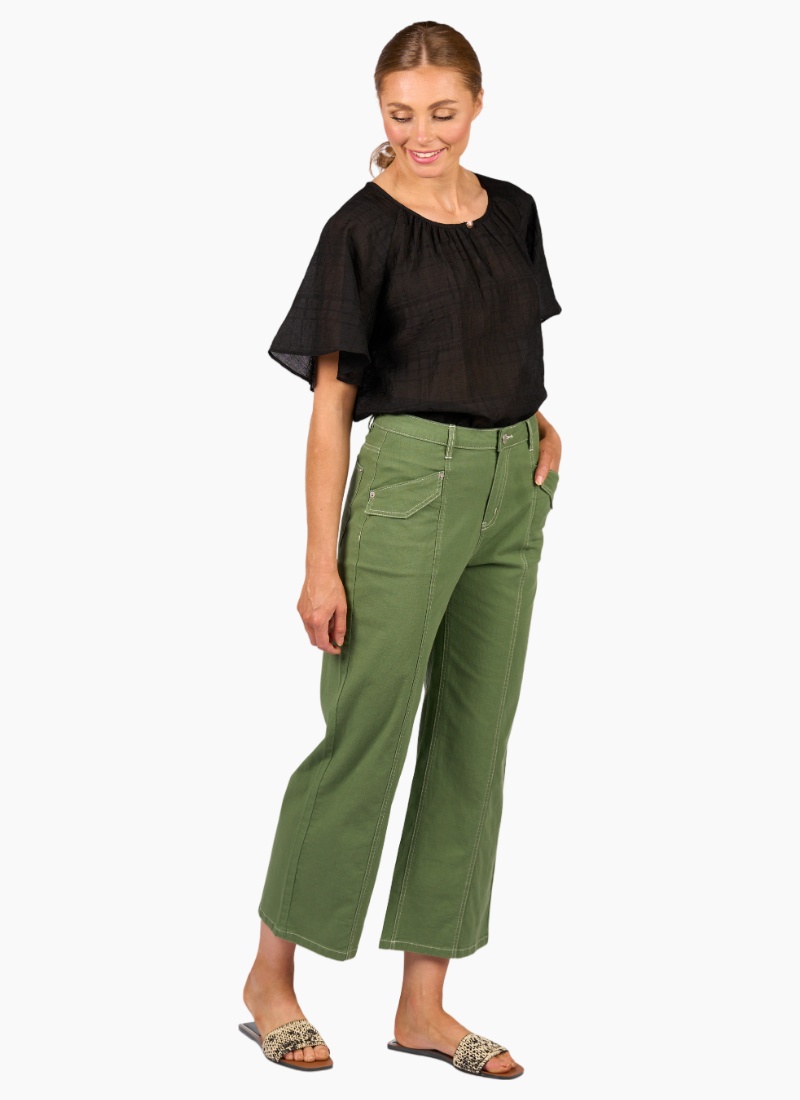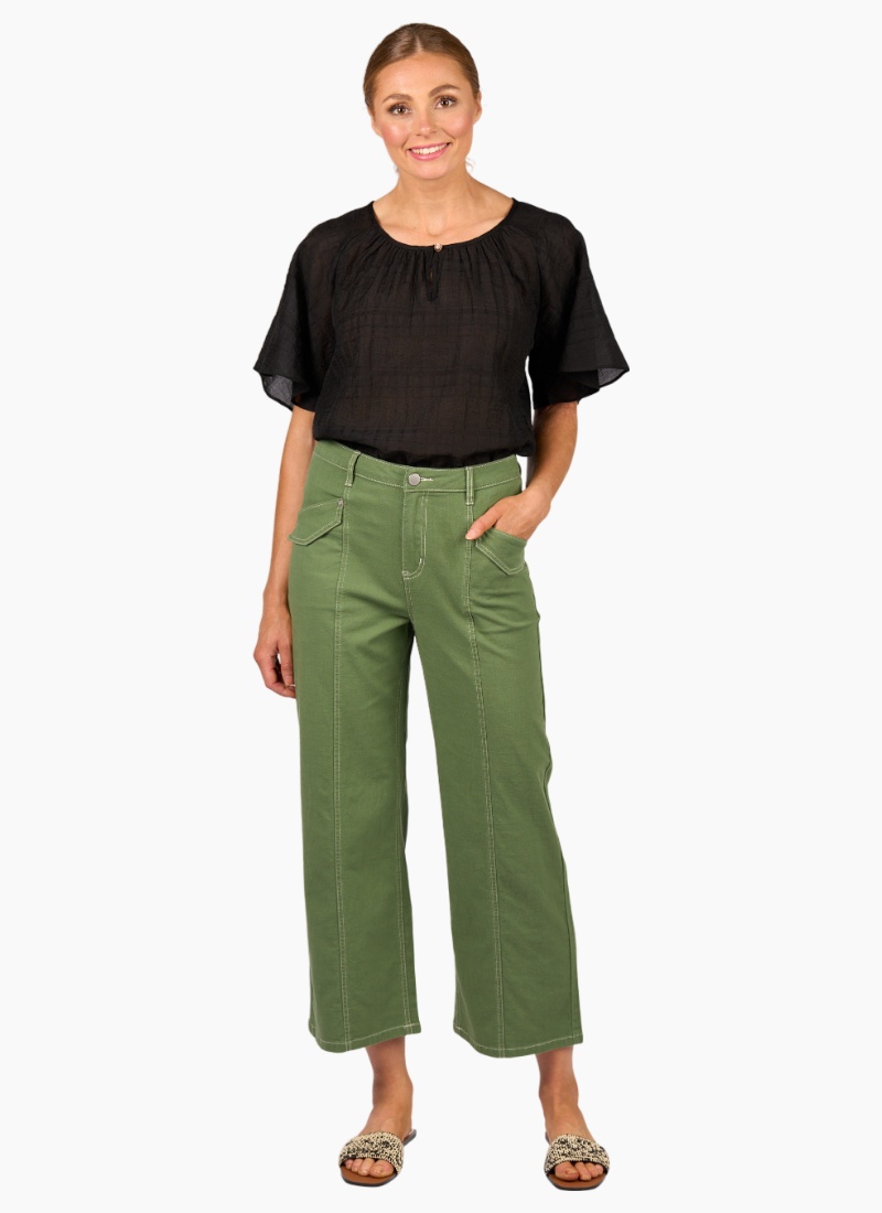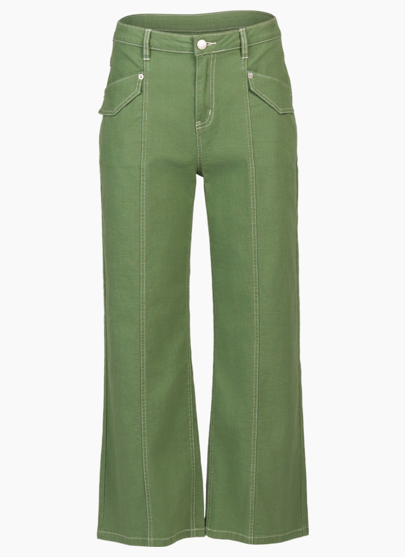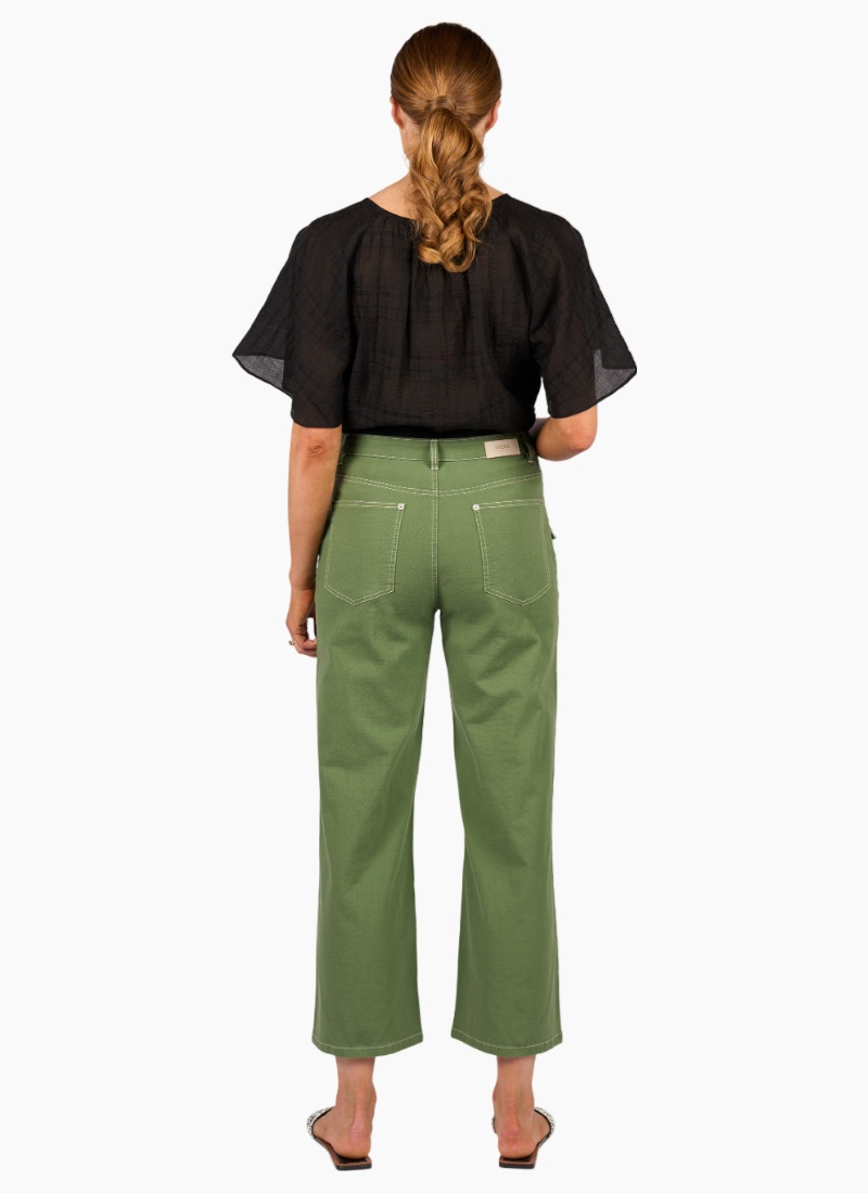 The Shade Pant in Olive is cut from a lightweight cotton stretch fabric and features white contrast stitching that adds definition to its shape. Designed with a front seam through the legs and flap patch pockets, it has a wide leg and ankle-grazing length for a clean, modern feel.• Made from a lightweight cotton/linen fabric • Wide leg ankle grazer fit • Centre front seam • Waistband features metal 'KNEWE' logo jean button closure, 2 front beltloops and 3 back beltloops • Zip fly • Front side angle pockets with flap detail and silver rivets • Leather 'KNEWE' brand patch on the right-hand side of the back waistband • Back patch pockets with silver rivets • Contrast tan stitching • Model is 175cm tall, and wears size 10
