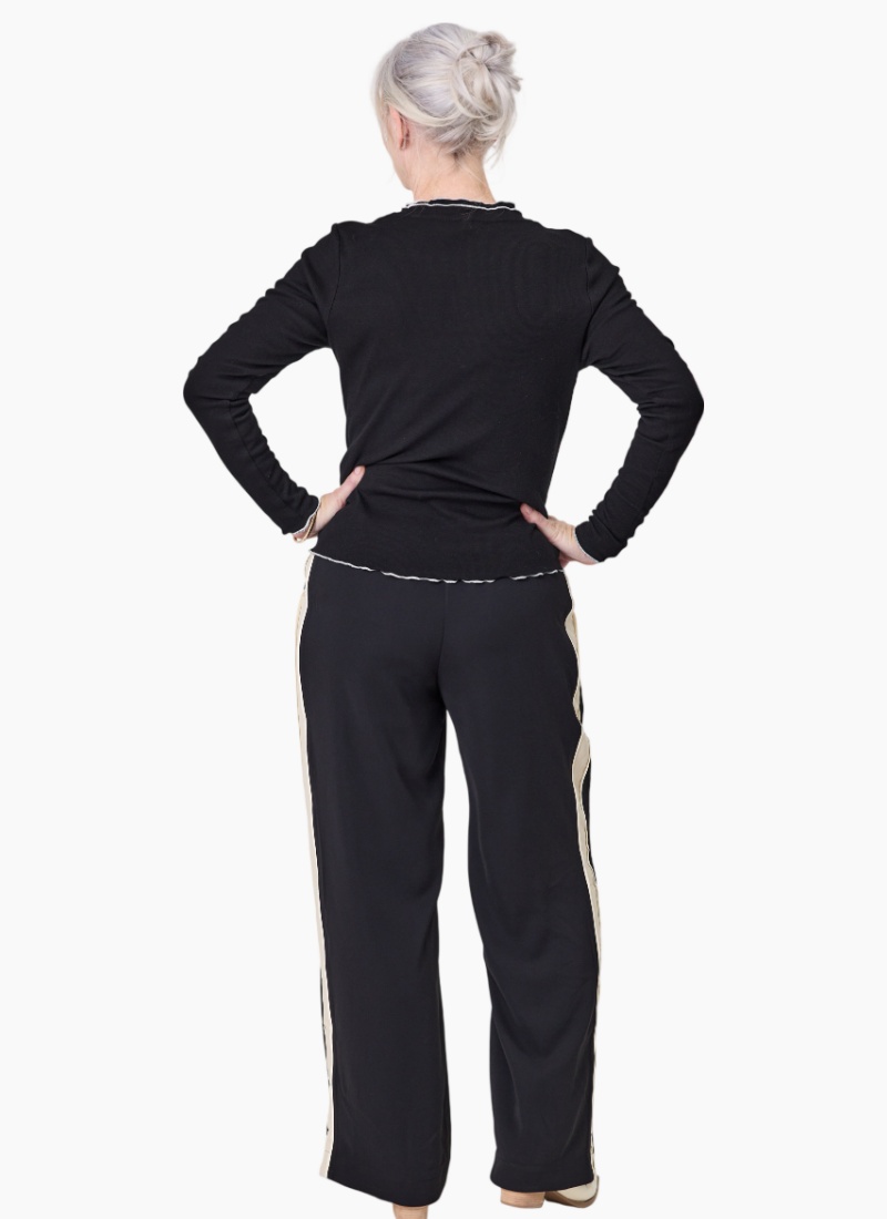 Introducing the Daria Pant from Lemon Tree. These fluid black pants with a contrasting cream side stripe bring modern polish to everyday dressing.