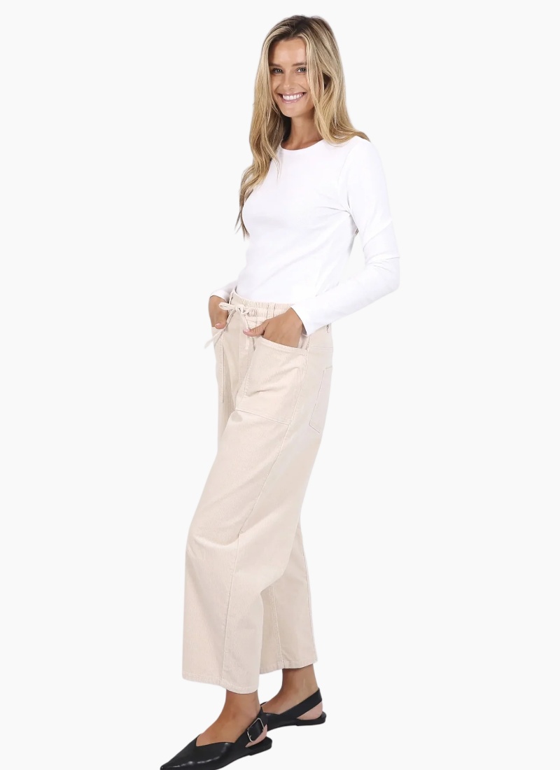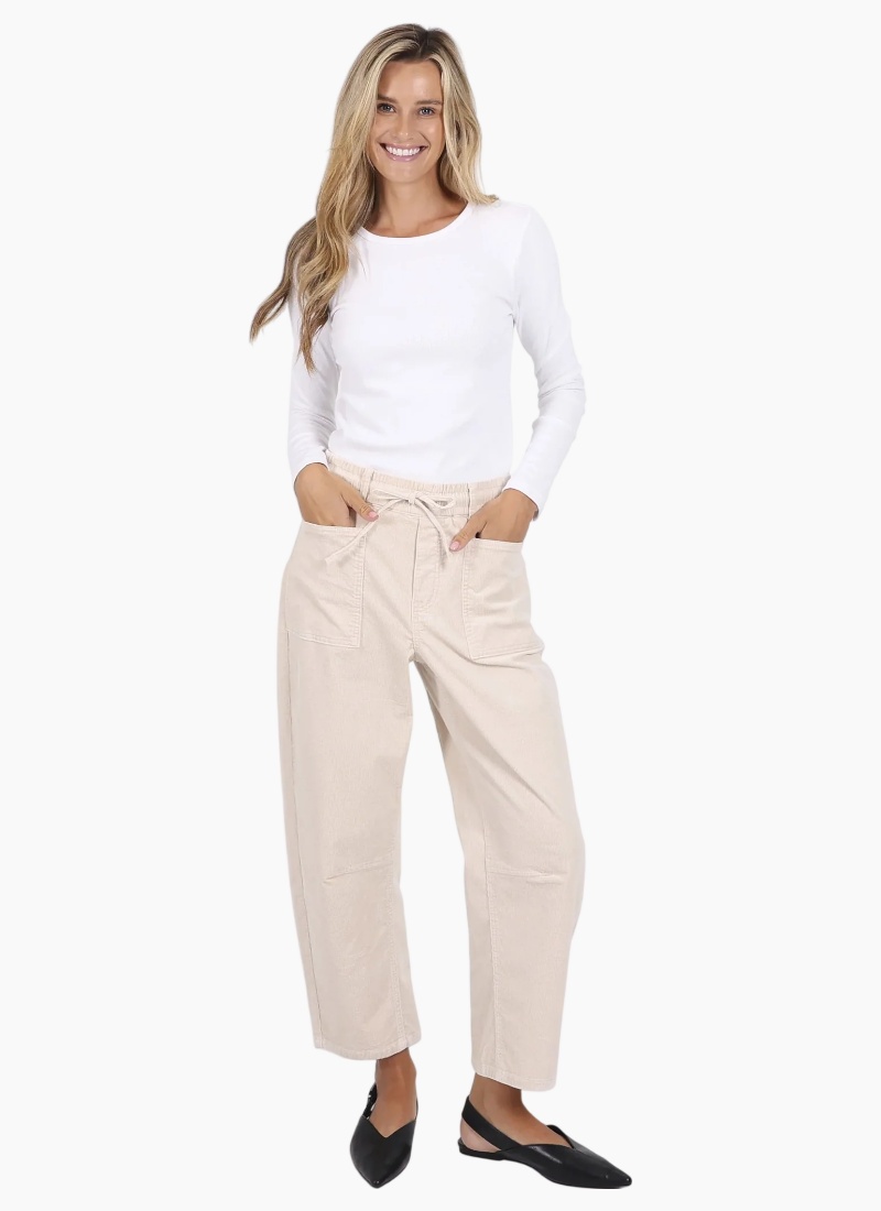 These corduroy barrel jeans combine comfort and style effortlessly. With a soft feel, elastic waistband, and adjustable drawstring, they’re made to move with you. Front flap pockets and back pockets add a functional touch, while the relaxed barrel shape fits and flatters every body. Comfortable, versatile, and perfectly on trend. Darcy is 173cm and is wearing size 10.