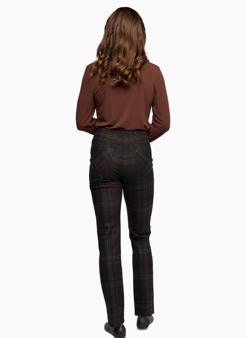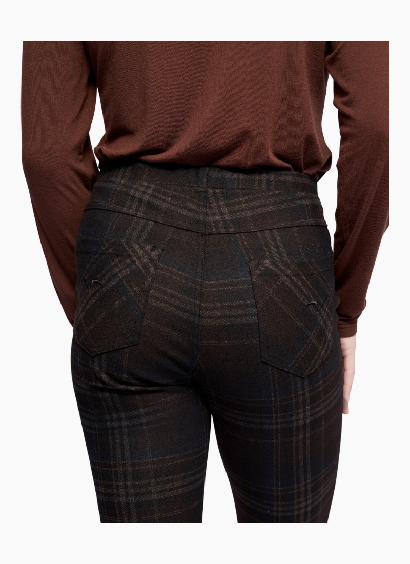 Full-length slim pant in stretch ponti fabric, designed in our Hugo print — a dark navy base with a dark brown and oat check pattern. This easy pull-on style features an elasticated waistband for a comfortable fit, finished with refined detailing including a faux fly, faux front pockets, and back patch pockets.• Slim leg, full-length ponti pant • Stretch ponti fabric for comfort and the perfect fit • Pull-on style • Elasticated waistband • Faux fly • Two faux front cutaway pockets • Two back patch pockets with ‘V’ stitching detail • Vassalli embroidery above wearer’s right back pocket • Model wears size 10