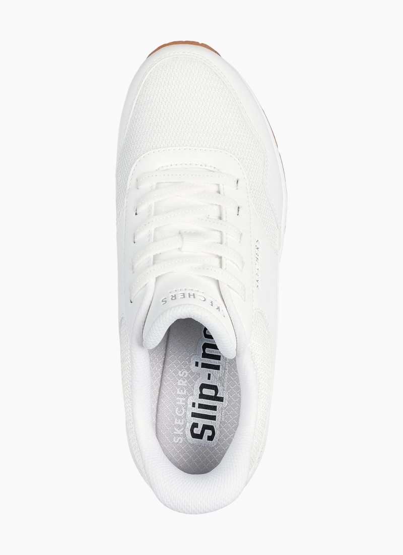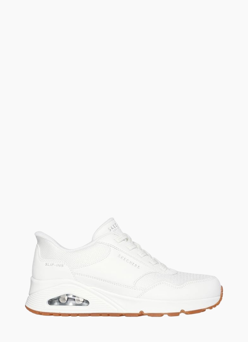 Step into sporty style and effortless comfort with Skechers Street™ Hands Free Slip-ins®: Uno - Banksia. Designed with our exclusive Heel Pillow™, this classic fashion silhouette features a duraleather and mesh upper with fixed stretch laces, Skechers Air-Cooled Memory Foam® insole, and a Skech-Air® visible airbag midsole.