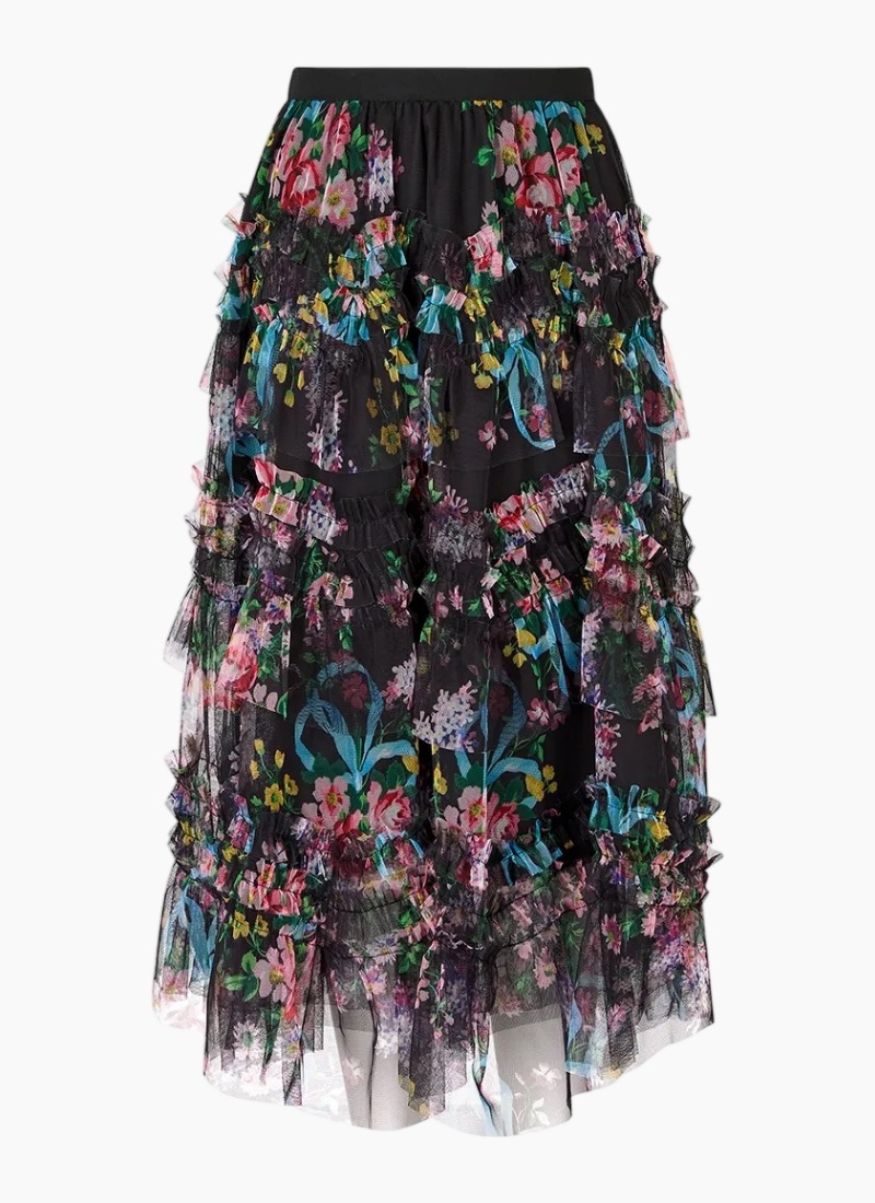 This mesh midi skirt will bring mystery and romance to your autumn wardrobe. A feminine look with a dark edge, we love the texture and movement from its pretty tiered ruffles. Perfect for a seasonal occasion or an evening out, you can pull out its colourful florals with bright, bold accessories. Black mesh skirt Midi length Comfortable elasticated waist Fabulous floral print Beautiful tiered ruffles
