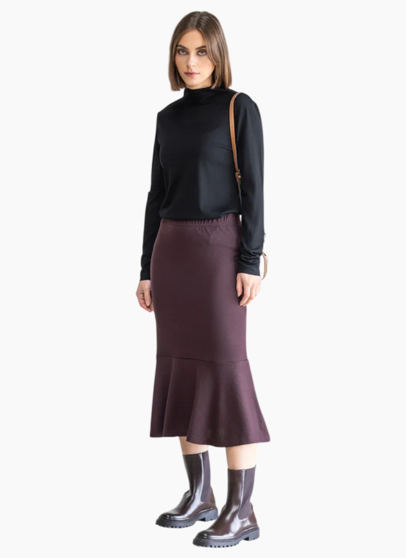Midi-length merino skirt in Berry - a rich dark plum tone. Designed with a slim fit through the hips and a softly flared peplum hem, this style offers comfortable movement and an easy, flattering silhouette.