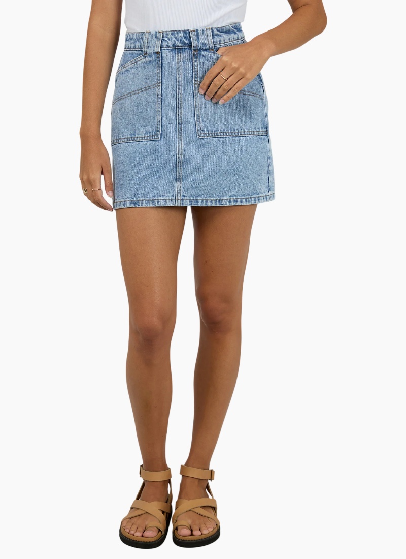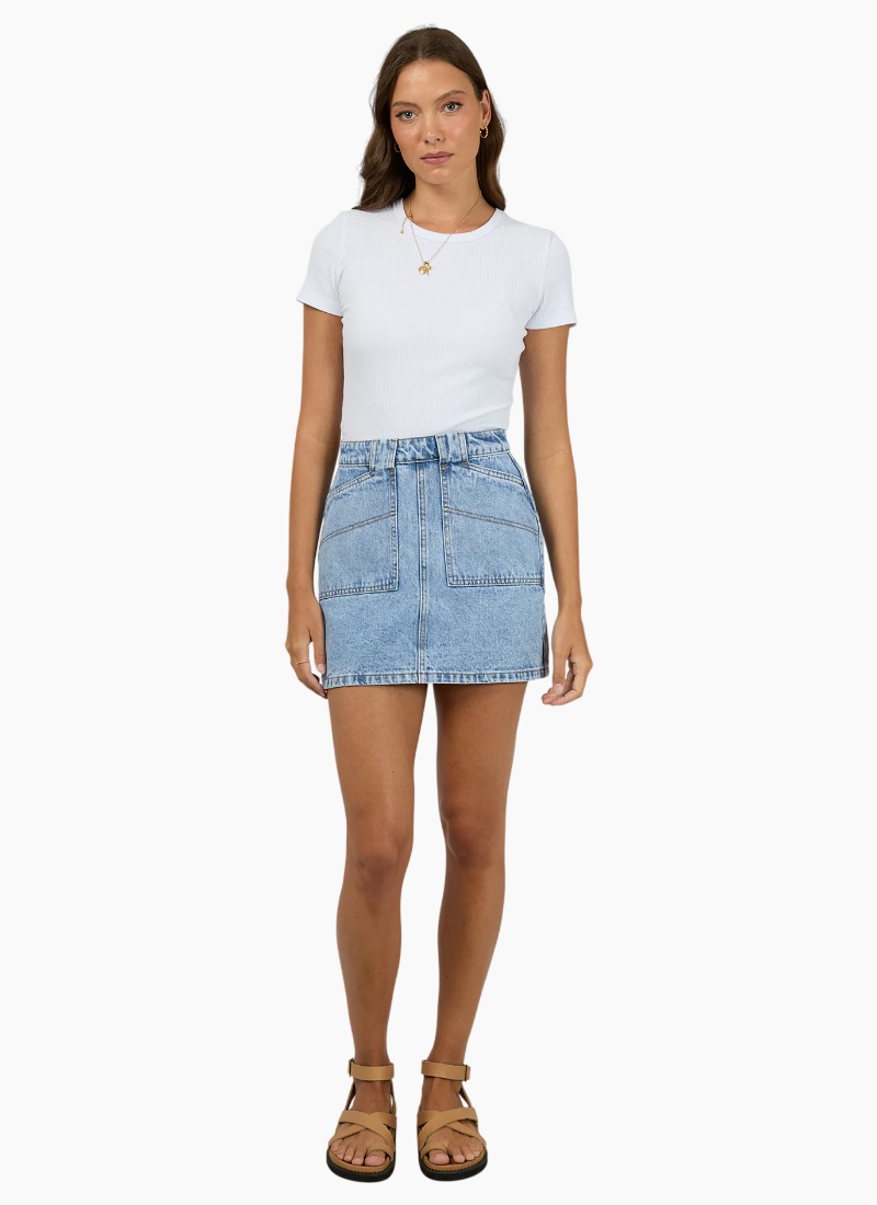 Introducing the All About Eve Becca Skirt Light Blue. This light blue denim mini offers a fresh, contemporary take on warm-weather dressing.