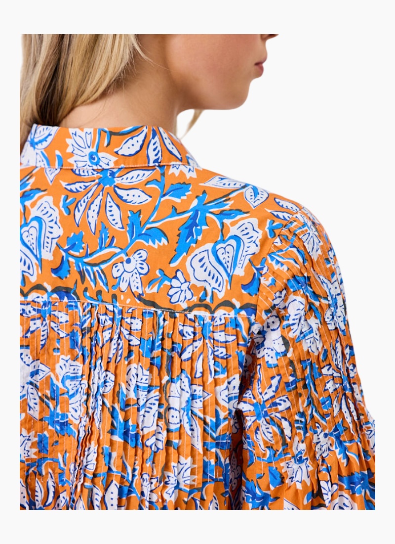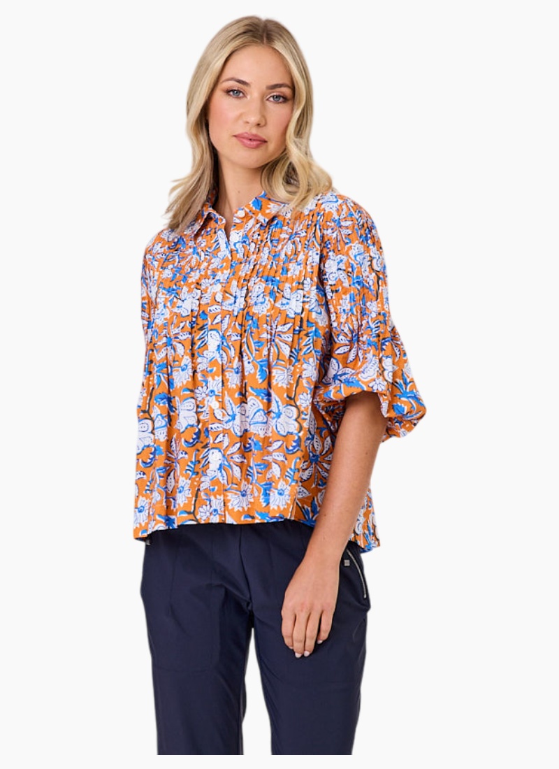 This Bubble shirt showcases an exquisite collar adorned with delicate fin pleating, adding a touch of sophistication. Featuring graceful 3/4 sleeves, it combines elegance and comfort. The buttoned front provides a classic touch, while the voluminous puffy sleeves create a playful yet refined silhouette, making it a fabulous shirt for any wardrobe.Both colourways Orange tapestry and Blue tapestry are warm tones.