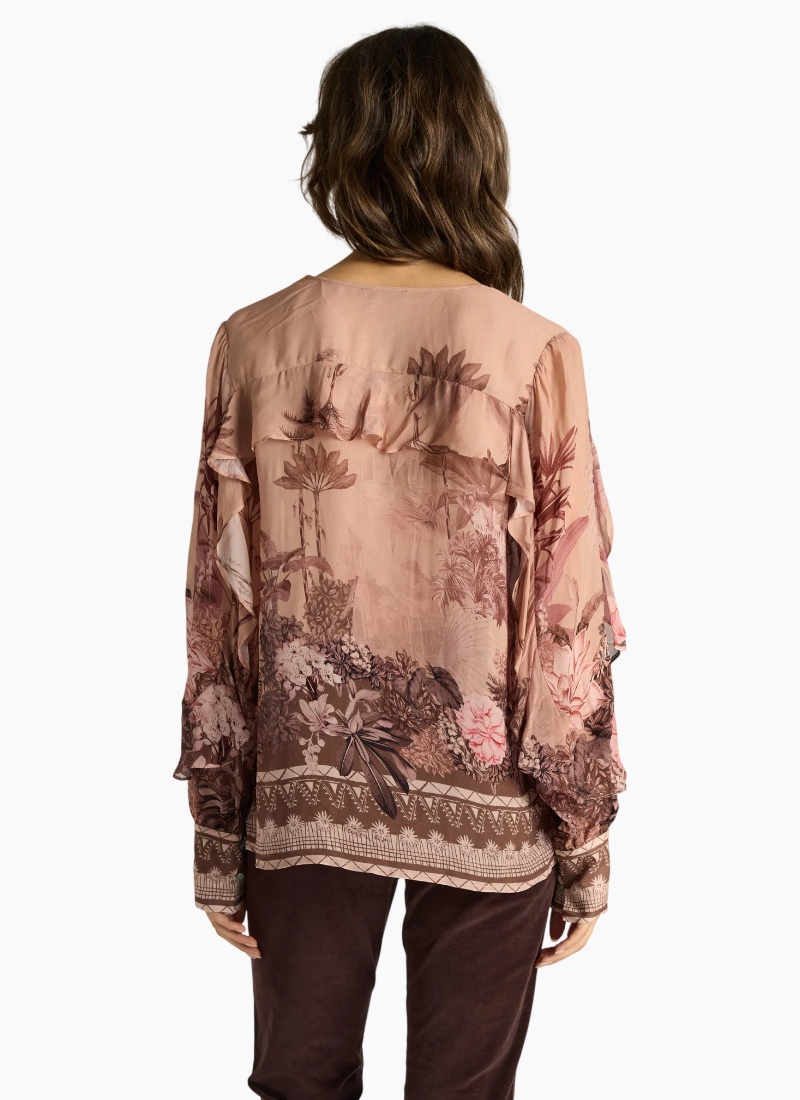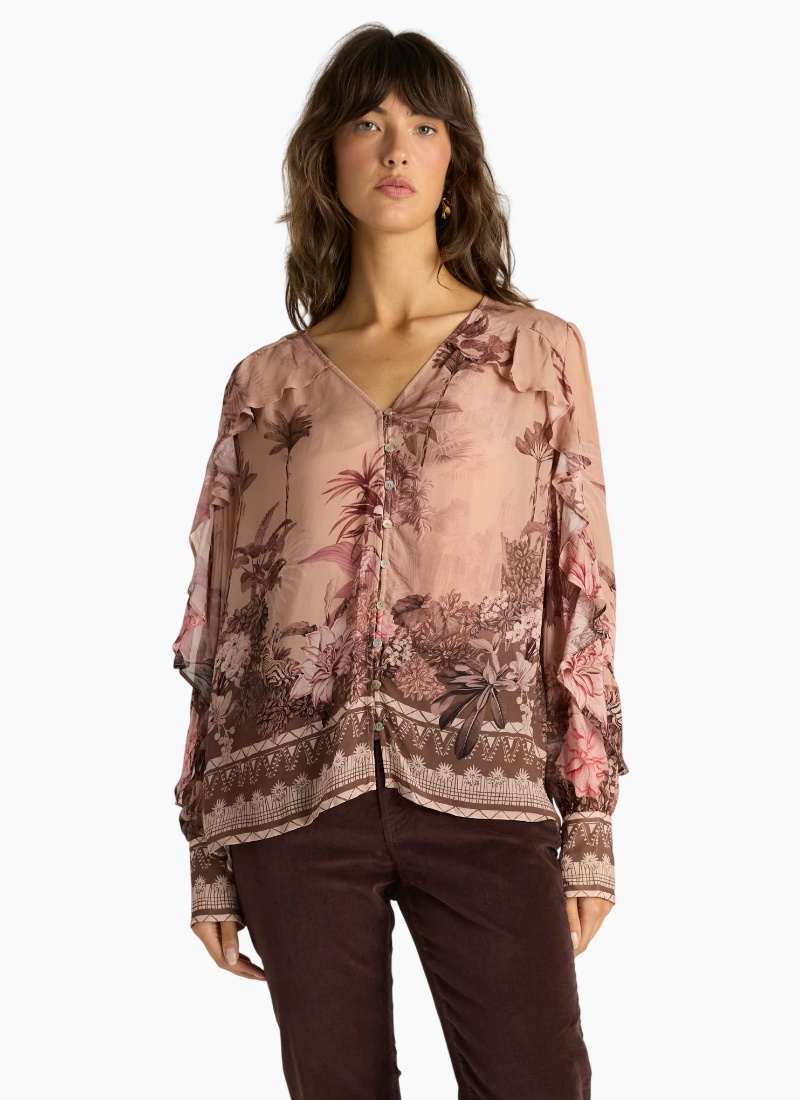 The Odette Ruffle Blouse balances softness with structured elegance. Delicate ruffle detailing frames its sheer silhouette, creating movement and texture. Lightweight and fluid, it layers effortlessly with the included camisole. A sophisticated transeasonal piece with elevated charm. -Exclusive print -Soft ruffle trim detailing -Soft, lightweight fabrication -Camisole included