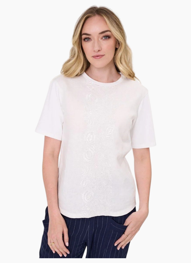 Introducing the Rosetta linen top white from Lemon Tree. This crisp white linen top features delicate embroidered detailing down the centre for a refined yet relaxed look.
