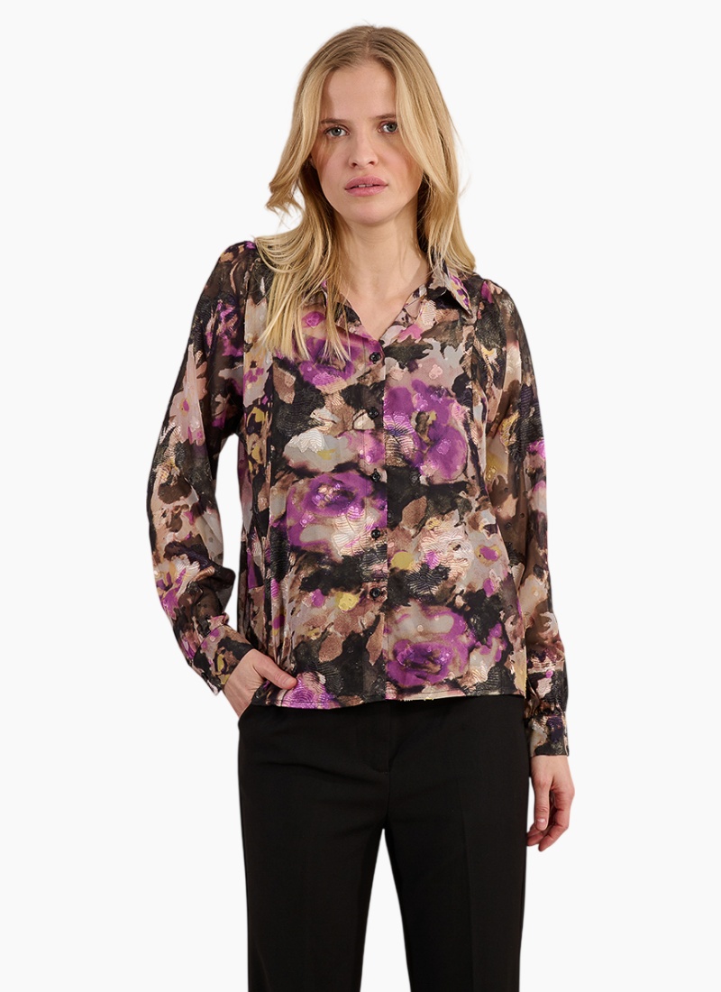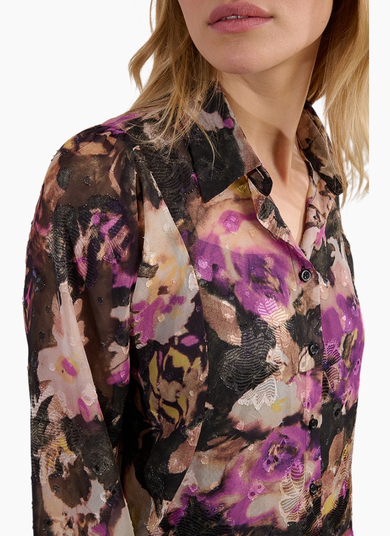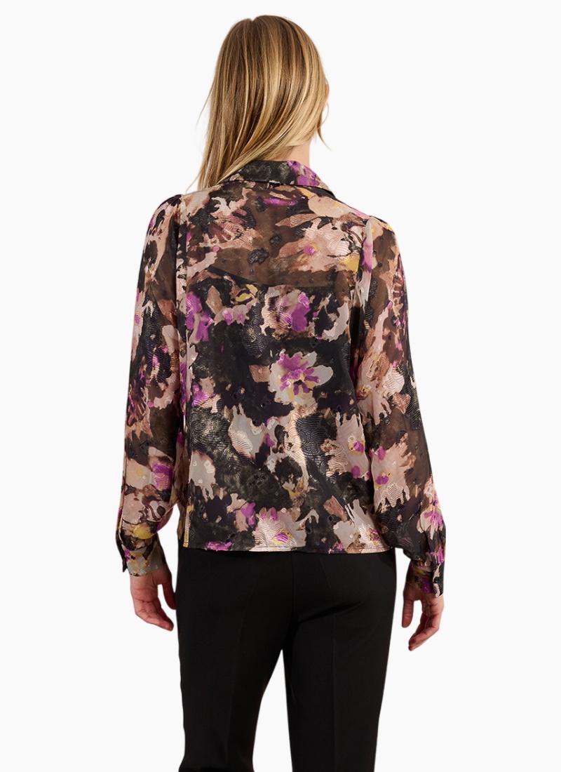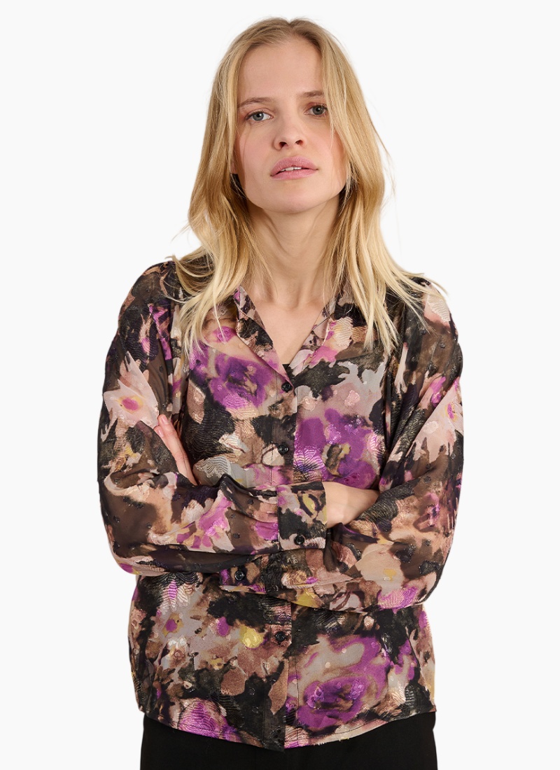 Introducing the Floral Shirt from Molly Bracken. This captivating piece pairs painterly purple florals with a softly sheer finish for effortless, elevated styling.