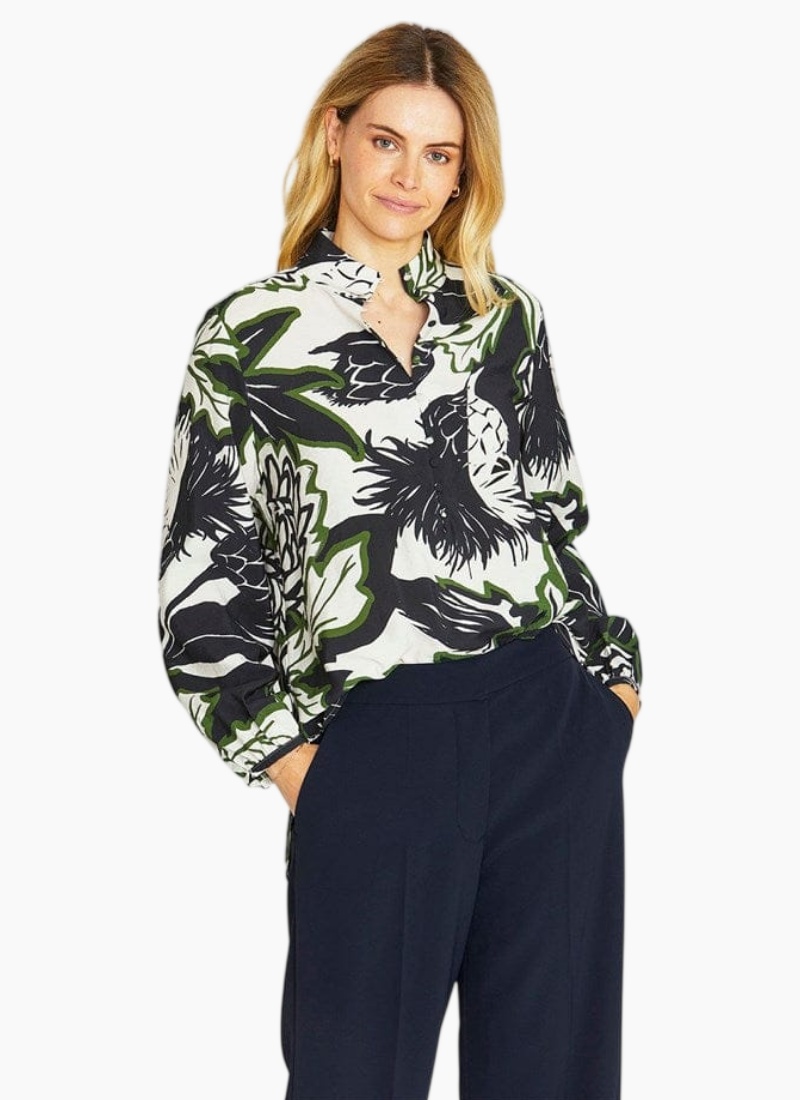 Introducing the Camille Abstract Floral Blouse from Ping Pong. A striking wardrobe piece, it brings modern botanical charm