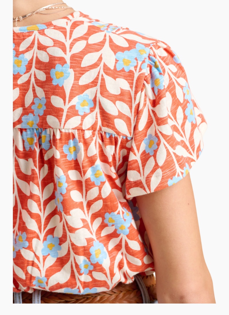 This t-shirt is pure joy with its happy, forget-me-not flower pattern, bringing a fresh spring feel to your wardrobe. The soft, lightweight fabric makes it perfect for breezy days, while the V-neck with tie detailing and wooden beads adds charm. Pair with denim.