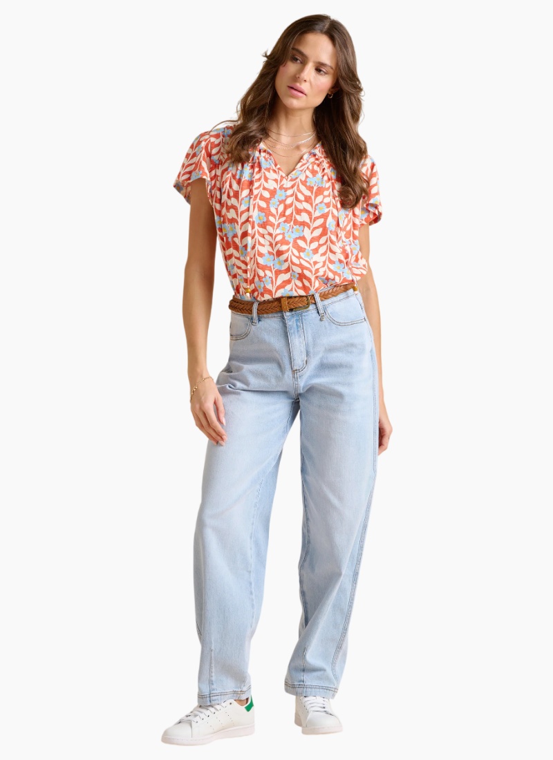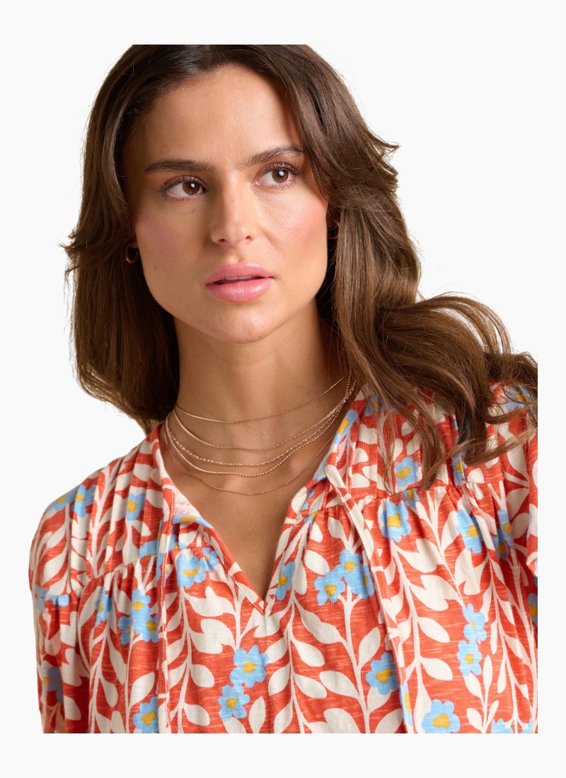 - Relaxed V-neck silhouette with gentle shoulder gathers for an easy, feminine fit