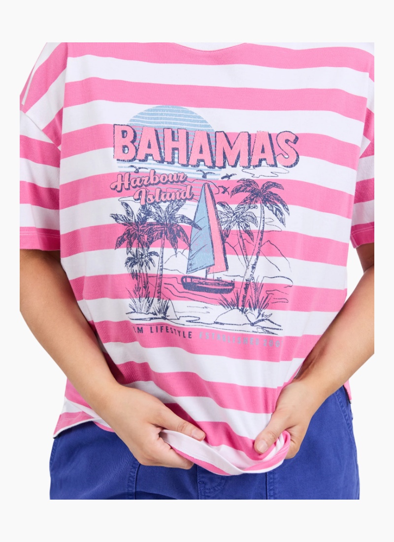 - Bold pink and white stripe colour with a vintage-inspired Bahamas graphic for instant holiday vibes; a standout piece in our Tops selection