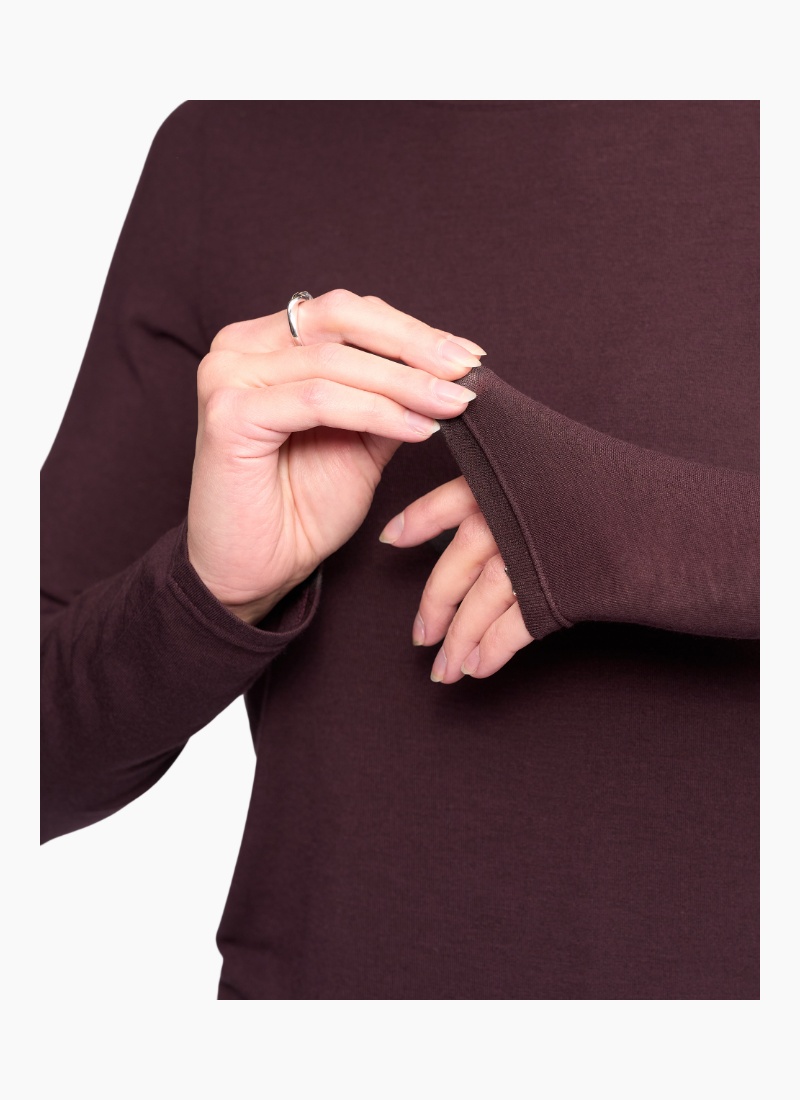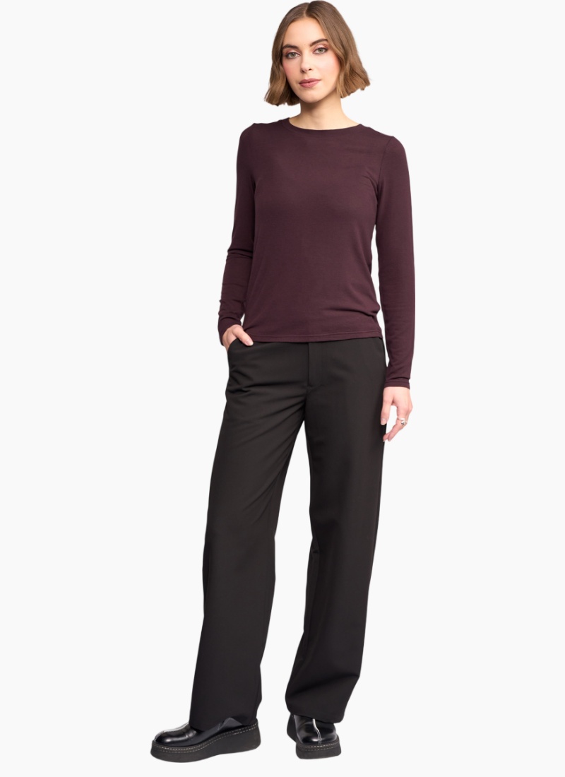Everyday long sleeve top in Raisin, a rich, deep purplish hue, crafted from a soft Tencel, wool, and elastane blend. Featuring a round neckline and a relaxed, comfortable fit, this versatile top is perfect for layering or wearing on its own.