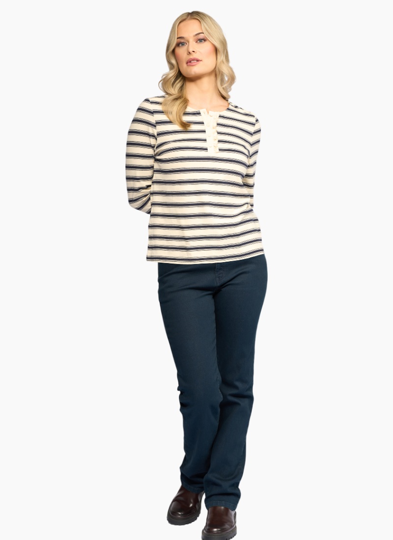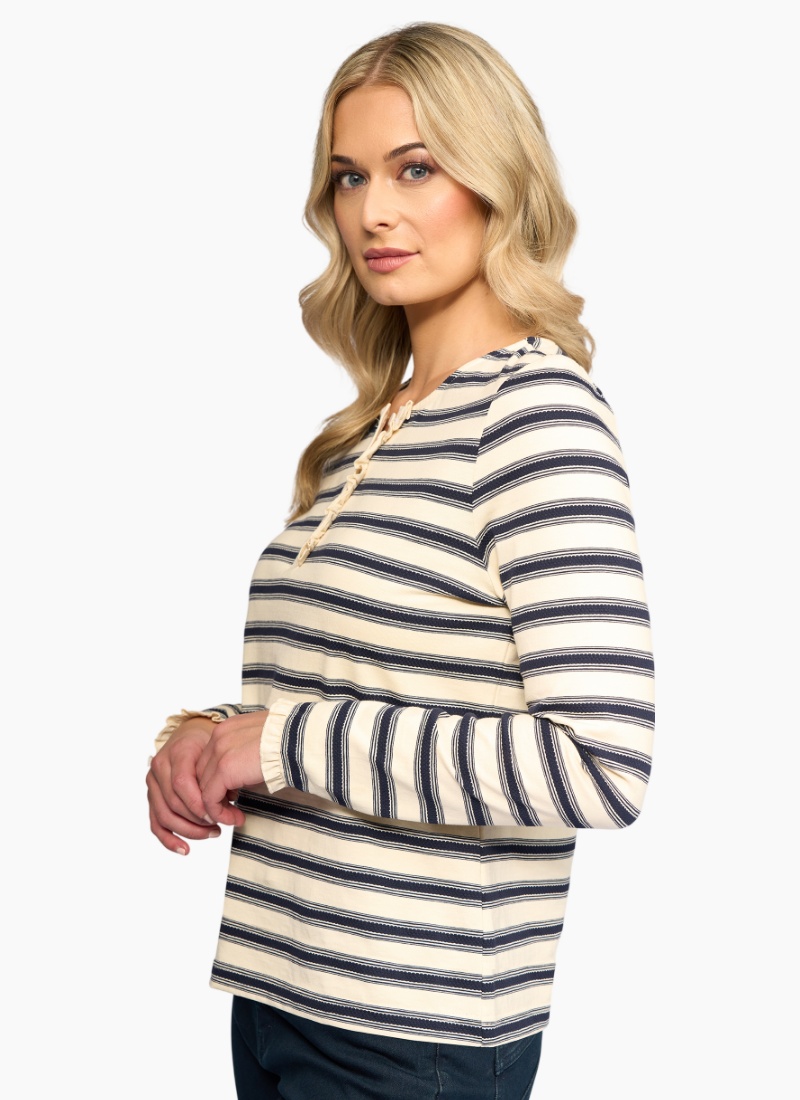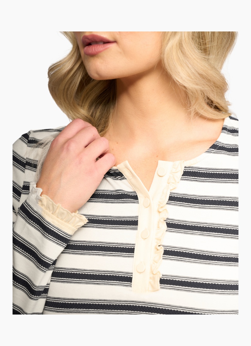 Casual long-sleeve top in an Oat/Ink stripe, featuring a round neckline with a partial button placket. Finished with soft ruffle detailing along the placket and sleeve cuffs, this style offers an easy, everyday look with a subtle, feminine touch.