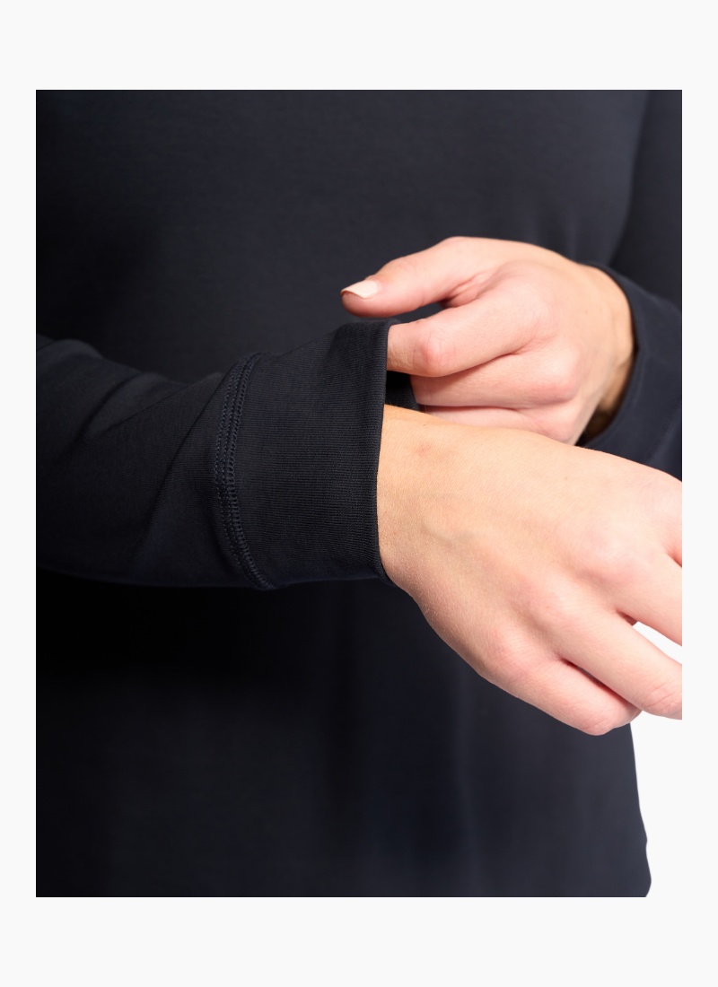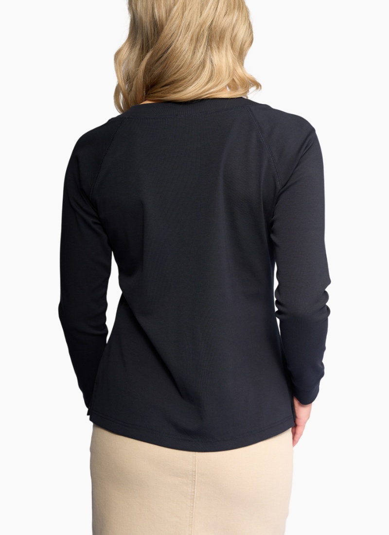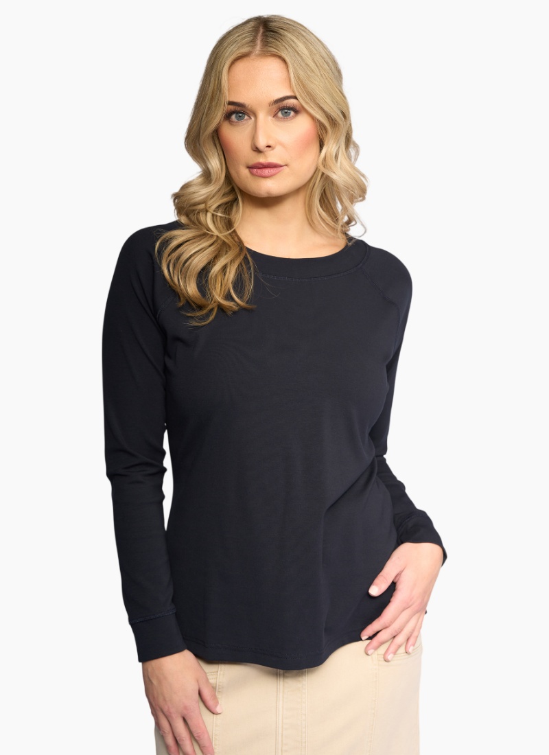 Casual long-sleeve top in soft stretch cotton, designed in our Ink colour — a deep dark navy. A comfortable everyday piece with a round neckline, raglan sleeves, and an easy, relaxed feel.