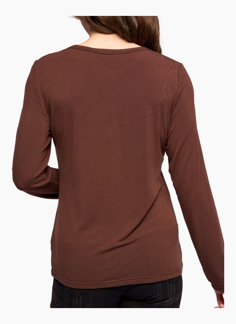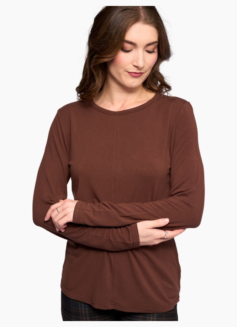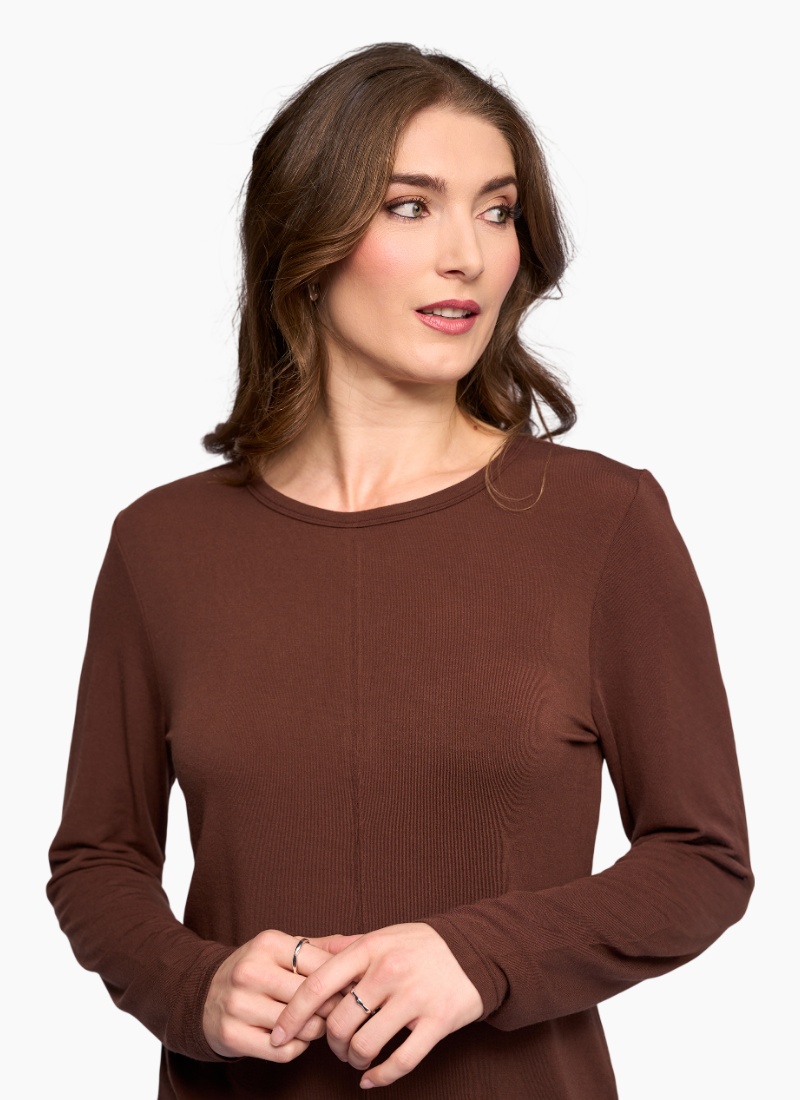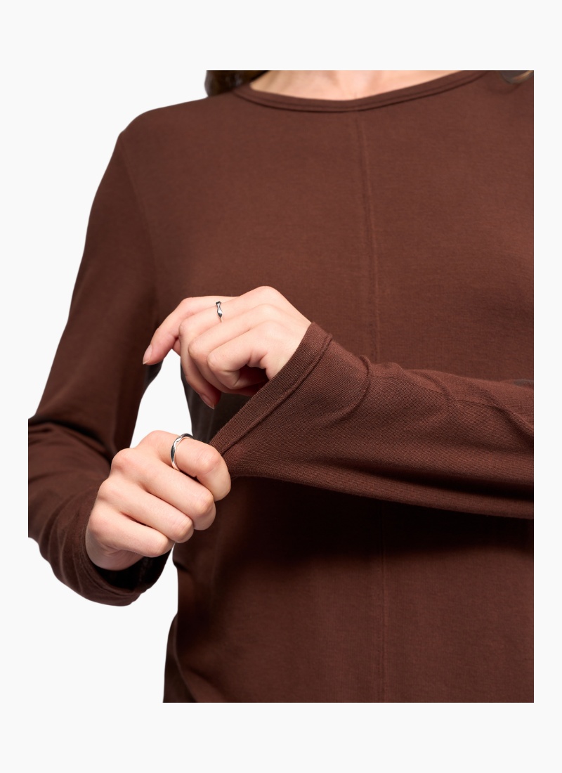 Soft long-sleeve top in our Chocolate colour — a rich dark brown. A versatile basic with a relaxed fit and comfortable stretch, finished with a round neckline and centre-front seam for a clean, understated look.